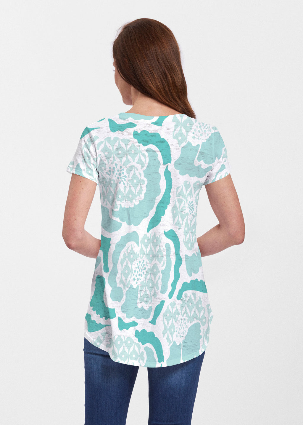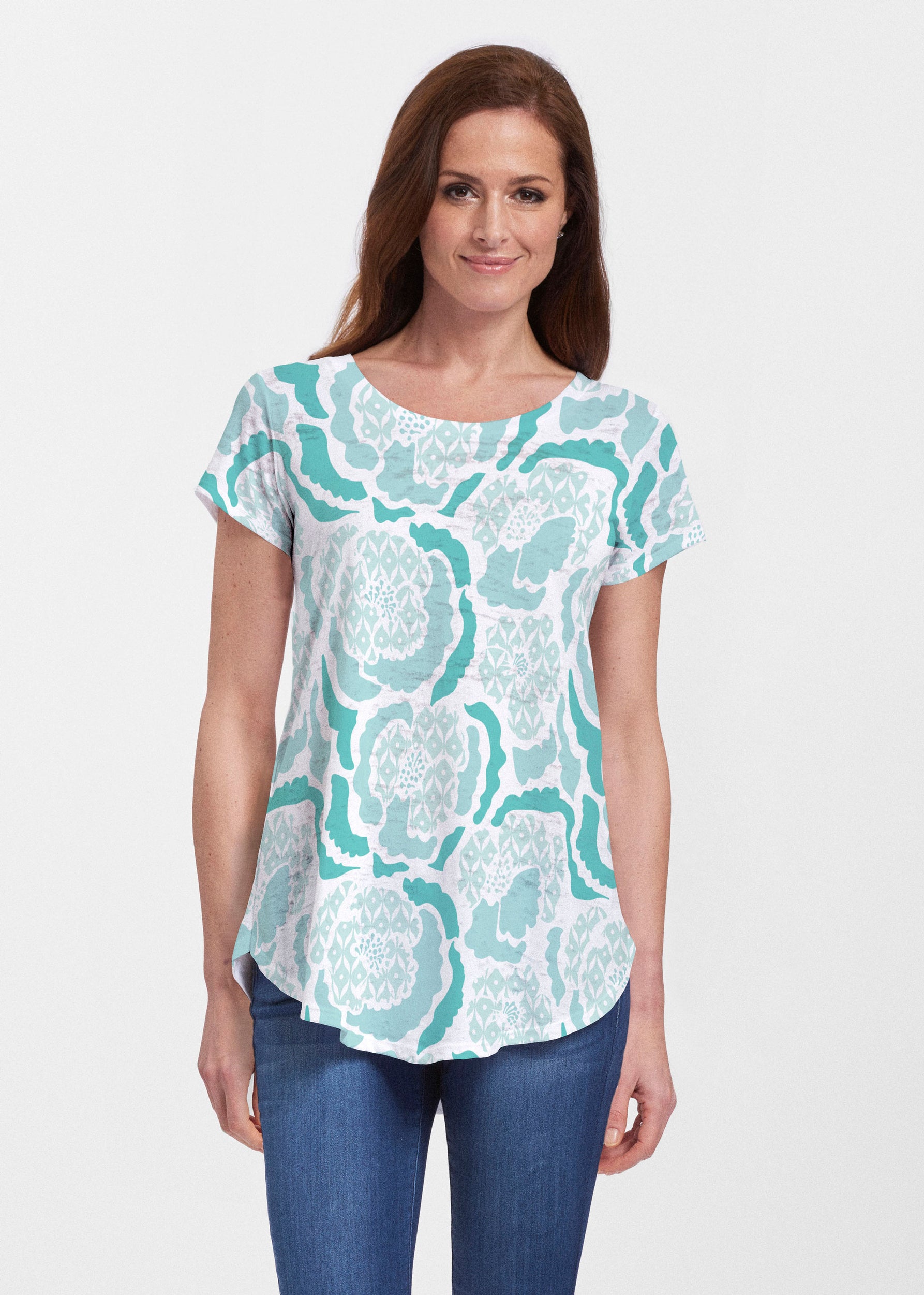 An effortlessly flattering tunic in our soft Signature burnout fabric featuring short sleeves and a scoop neck with a body that flows into a full, swinging shirttail hem.