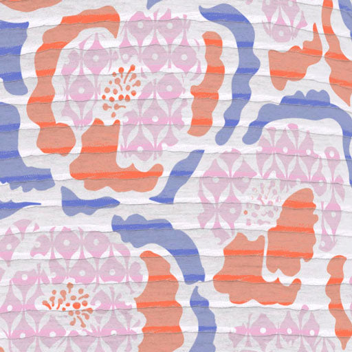 A pink and white geo design of peonies amongst festive colors of royal blue and orange.