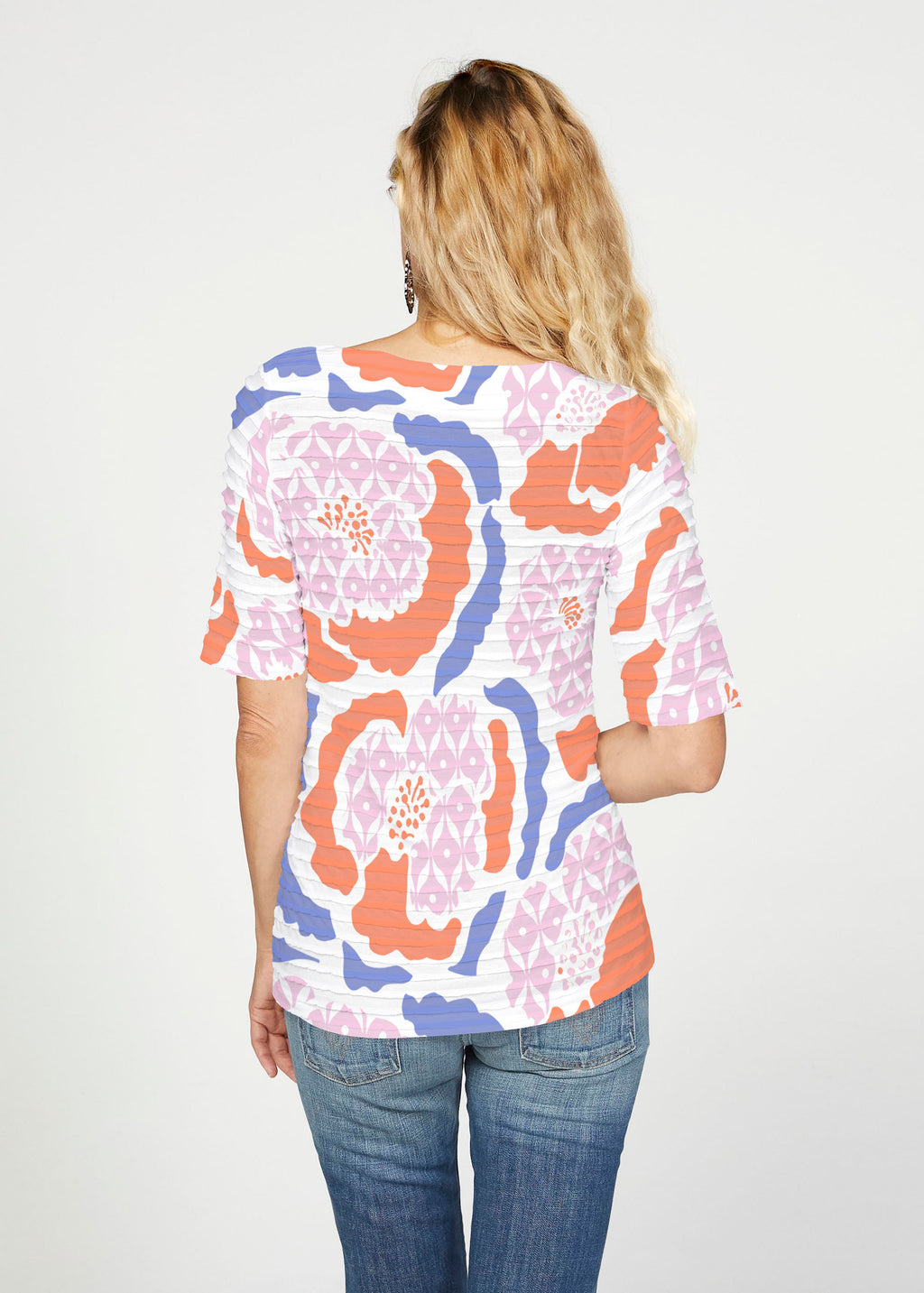 The uniquely soft, pleated texture in this Banded fabric gives the elbow sleeve and boat neck top a fun and sophisticated look. Easy relaxed fit with a hemline that comes below the hip.