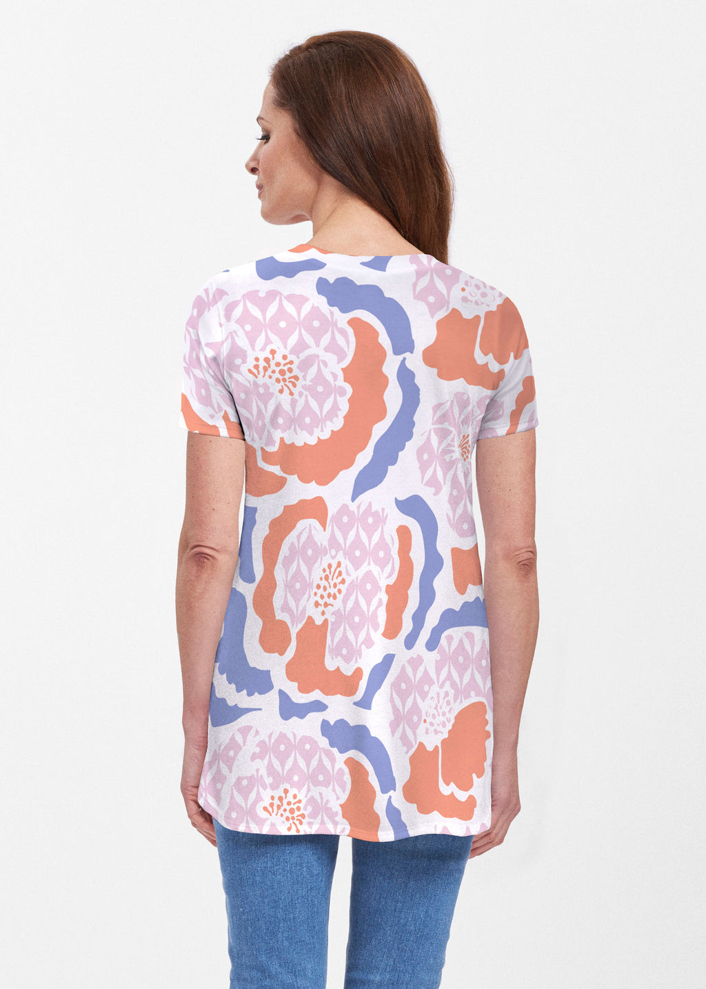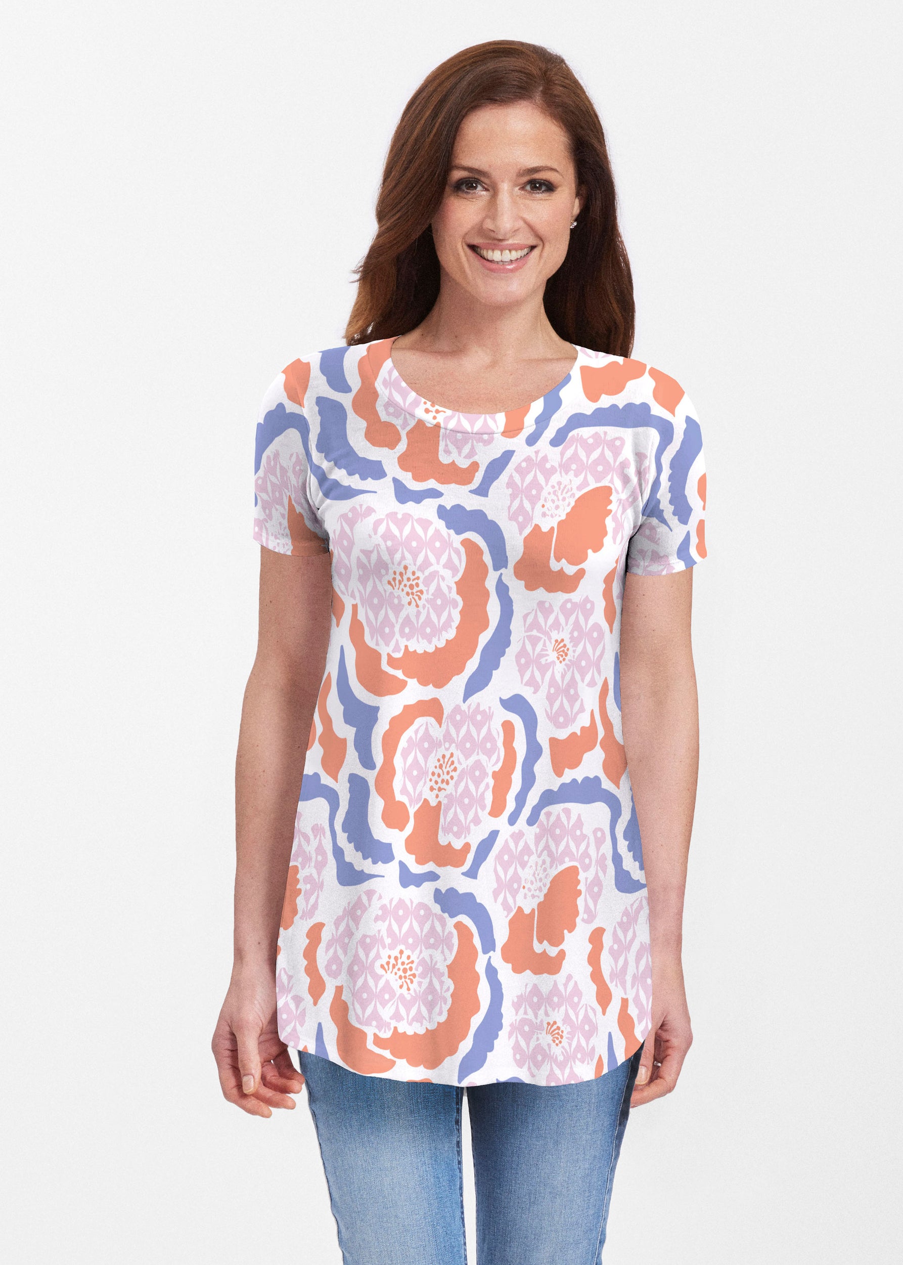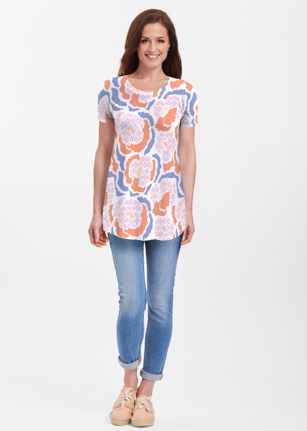 Our soft and feminine short sleeve silhouette tunic is sure to flatter any figure. Made in our Butterknit fabic that flows into a relaxed curved hem that is slightly longer in the back with subtle side slits.