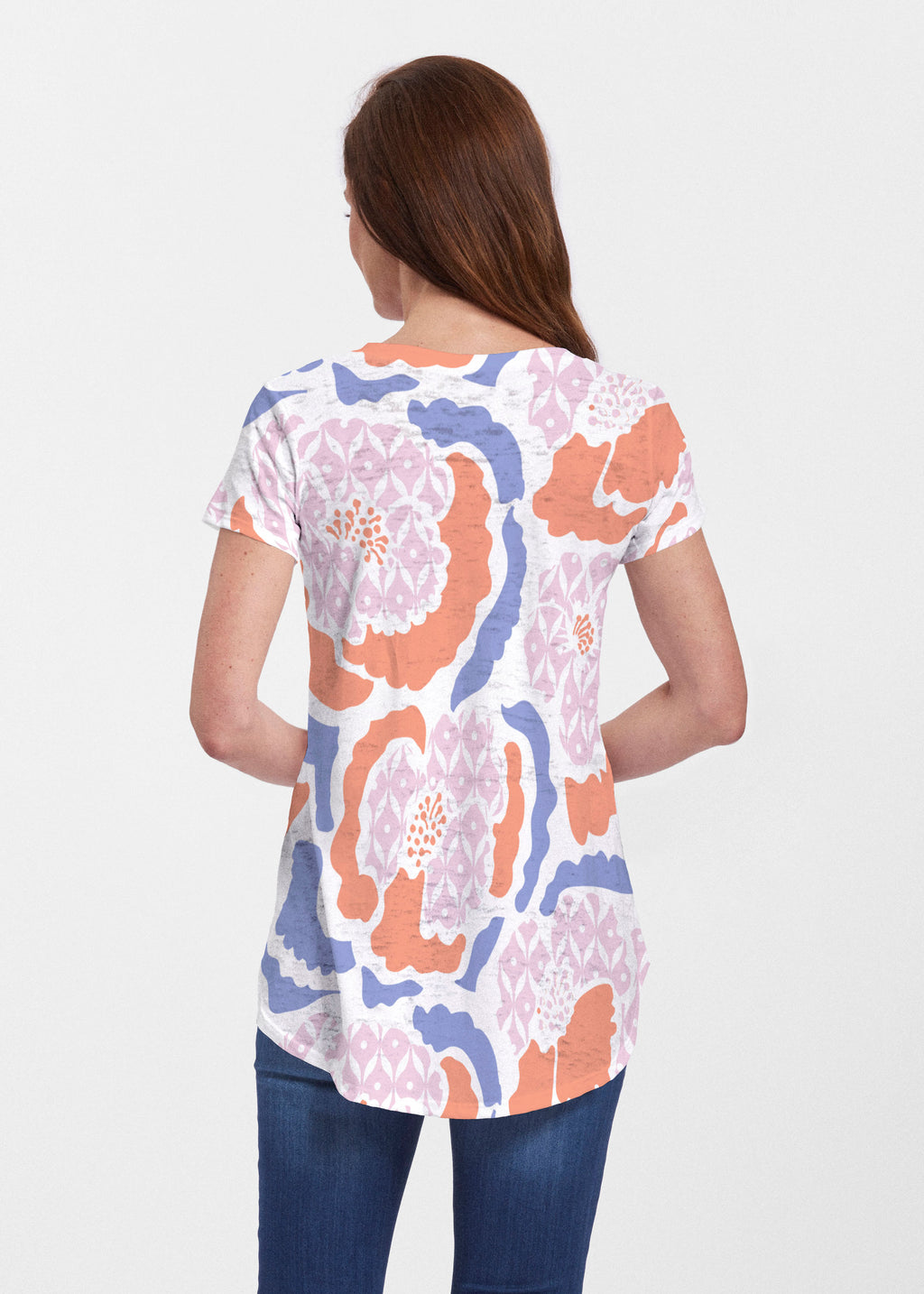 An effortlessly flattering tunic in our soft Signature burnout fabric featuring short sleeves and a scoop neck with a body that flows into a full, swinging shirttail hem.