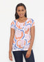 A pink and white geo design of peonies amongst festive colors of royal blue and orange.
