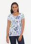 Print design is reminiscent of a beautiful floral garden, featuring bold blue flowers against a clean white canvas, with just a dash of orange to add a pop of color for a a playful and energetic element making a stylish garden party statement.