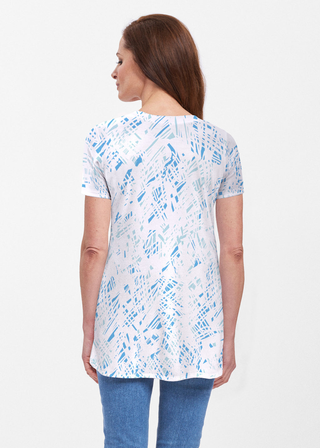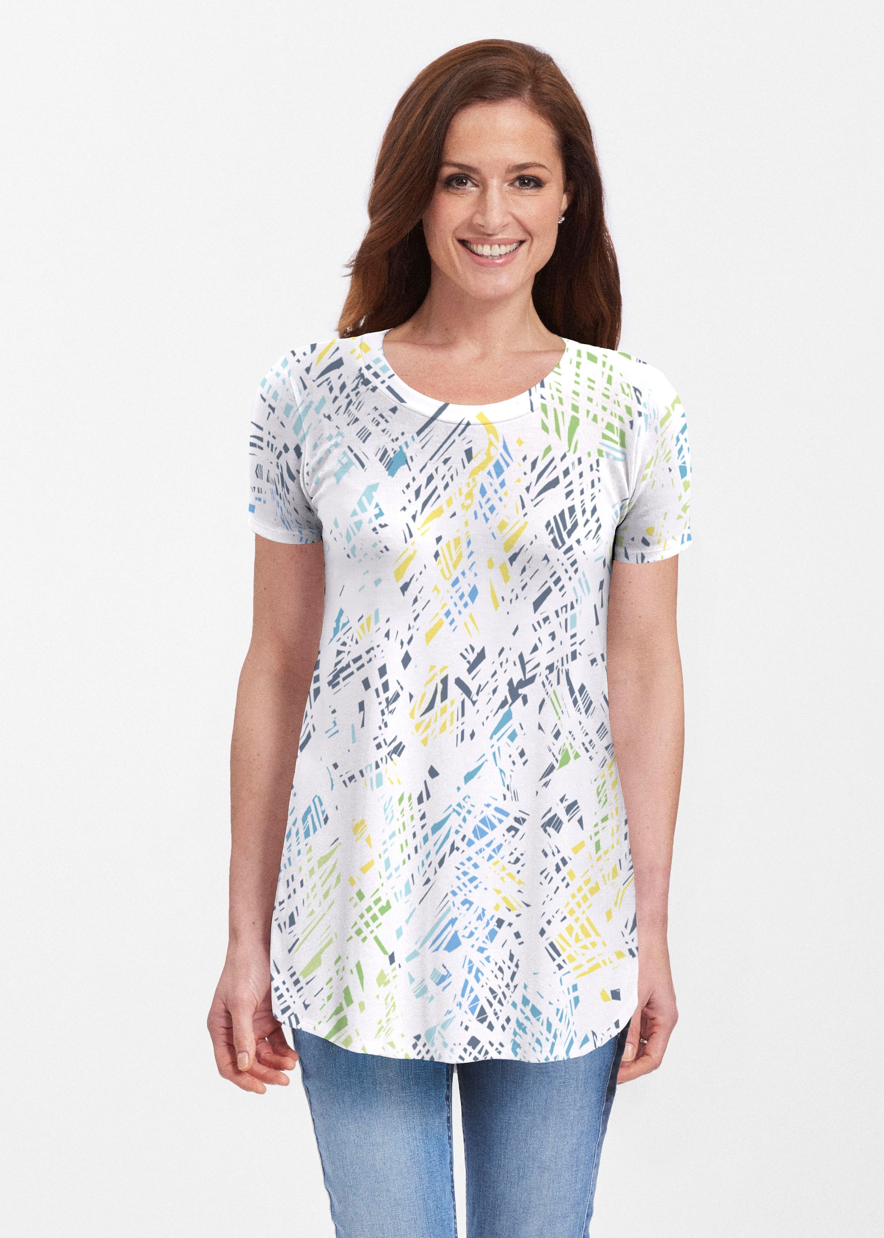 Our soft and feminine short sleeve silhouette tunic is sure to flatter any figure. Made in our Butterknit fabic that flows into a relaxed curved hem that is slightly longer in the back with subtle side slits.
