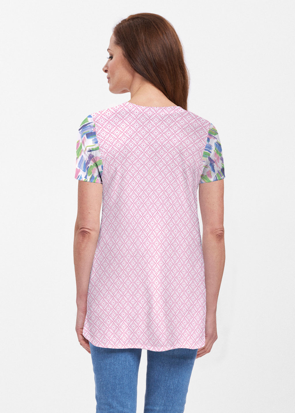 Our soft and feminine short sleeve silhouette tunic is sure to flatter any figure. Made in our Butterknit fabic that flows into a relaxed curved hem that is slightly longer in the back with subtle side slits.