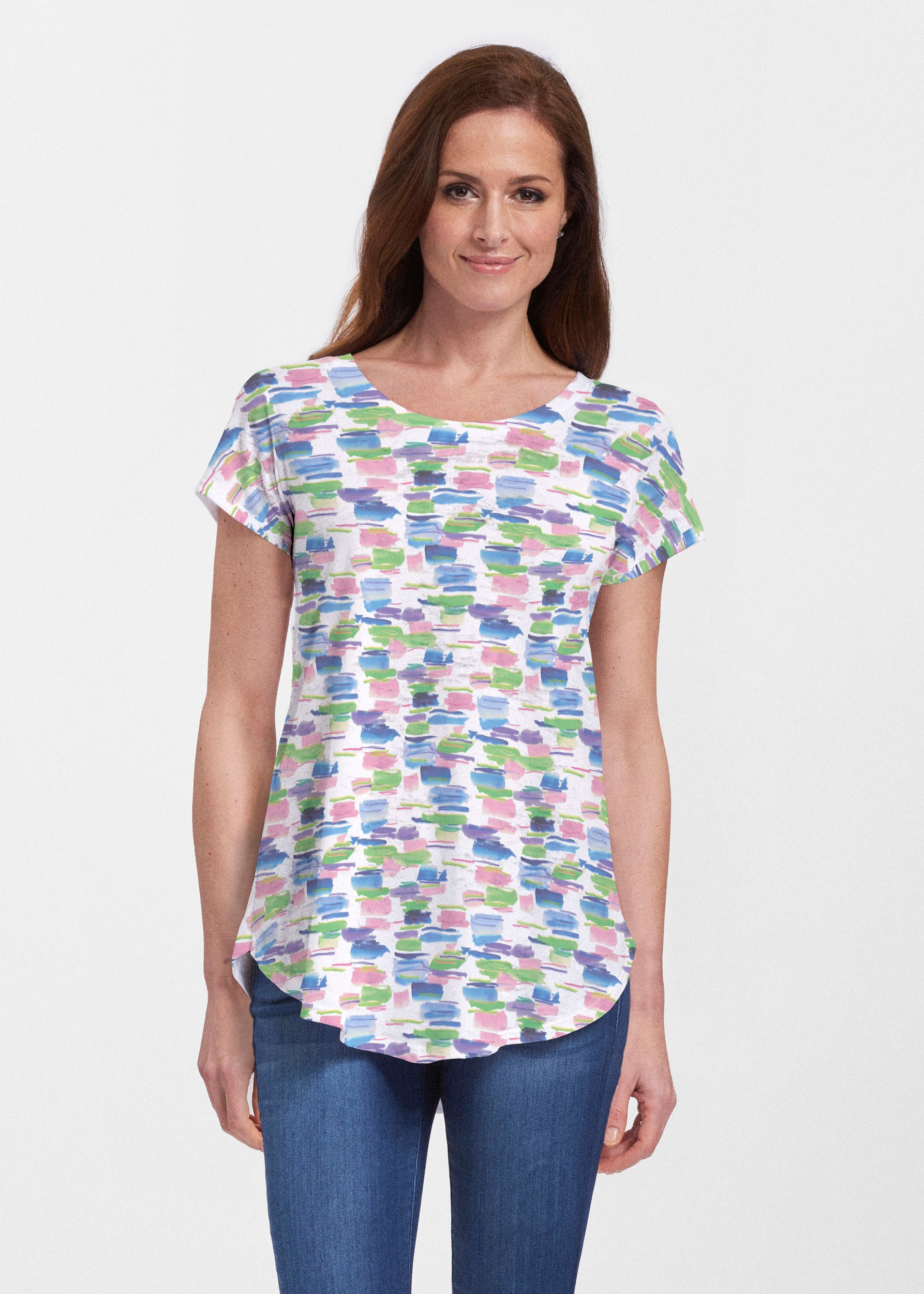An effortlessly flattering tunic in our soft Signature burnout fabric featuring short sleeves and a scoop neck with a body that flows into a full, swinging shirttail hem.