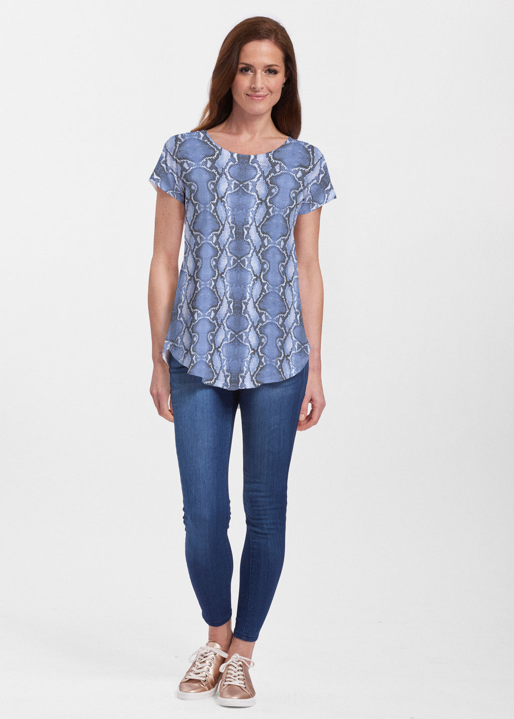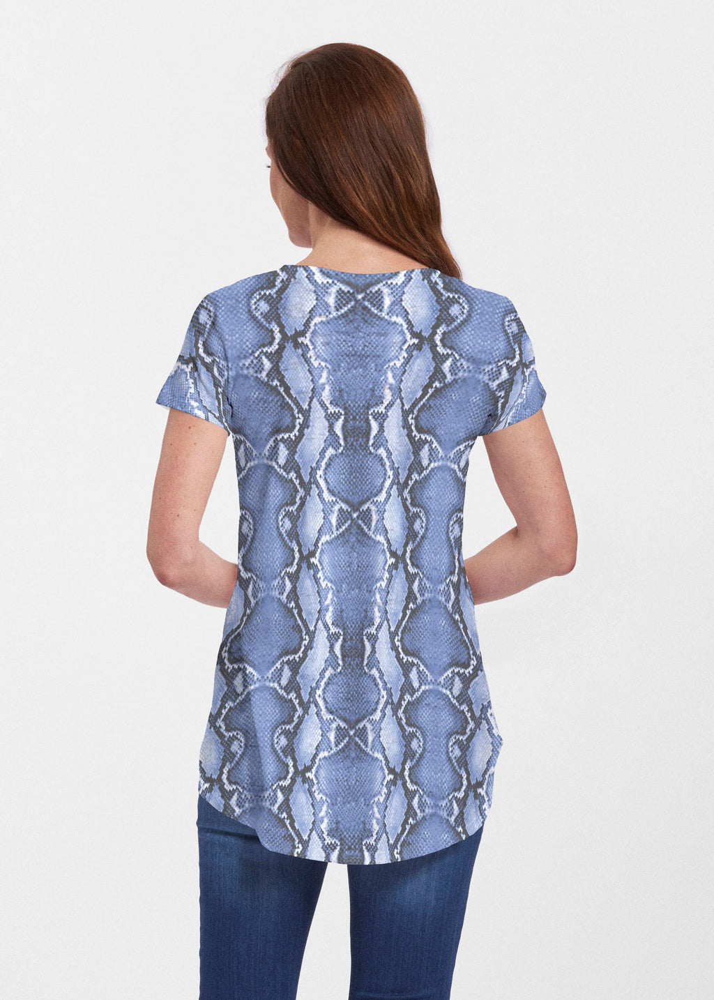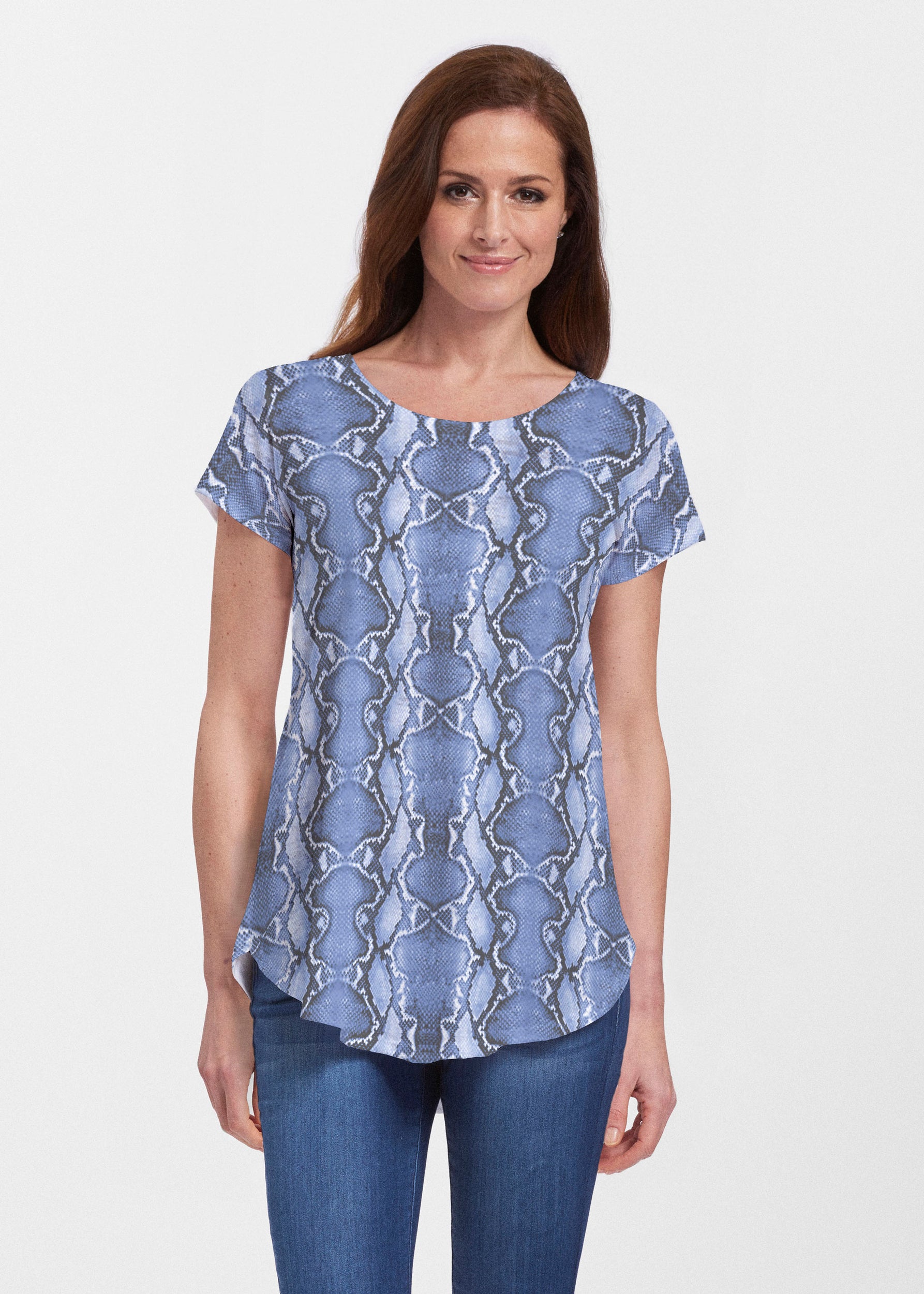 An effortlessly flattering tunic in our soft Signature burnout fabric featuring short sleeves and a scoop neck with a body that flows into a full, swinging shirttail hem.