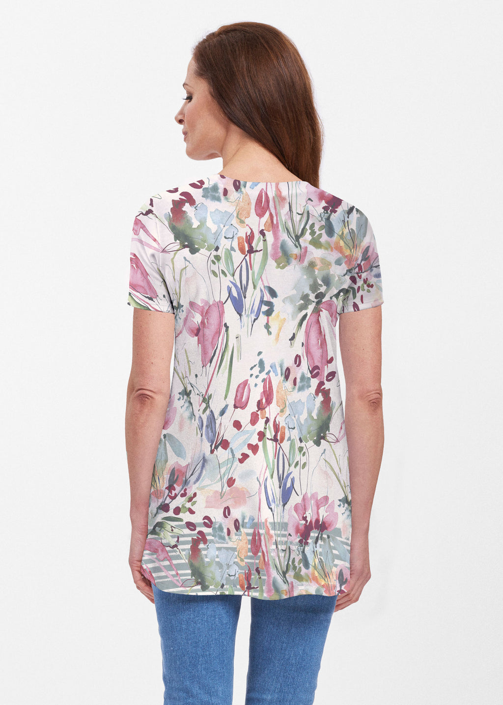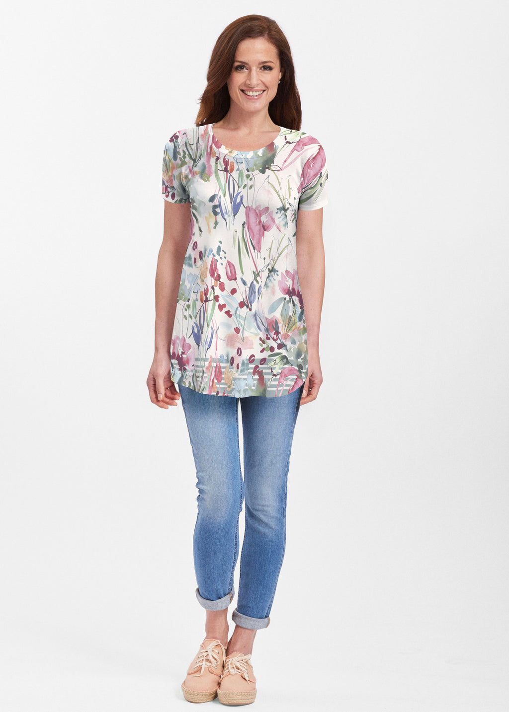 Our soft and feminine short sleeve silhouette tunic is sure to flatter any figure. Made in our Butterknit fabic that flows into a relaxed curved hem that is slightly longer in the back with subtle side slits.
