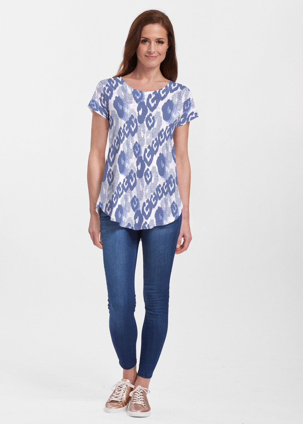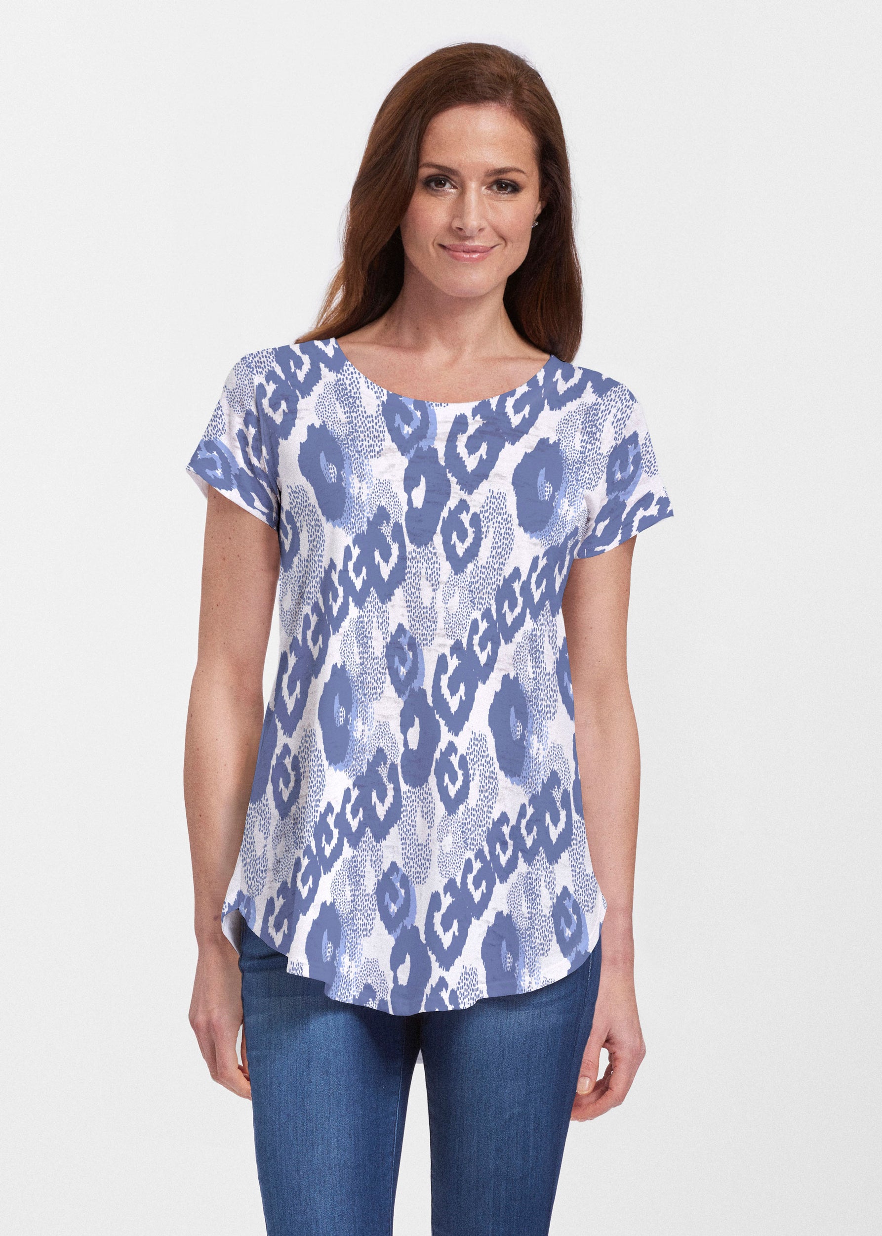 An effortlessly flattering tunic in our soft Signature burnout fabric featuring short sleeves and a scoop neck with a body that flows into a full, swinging shirttail hem.