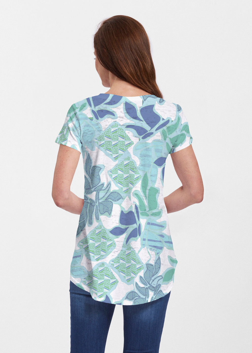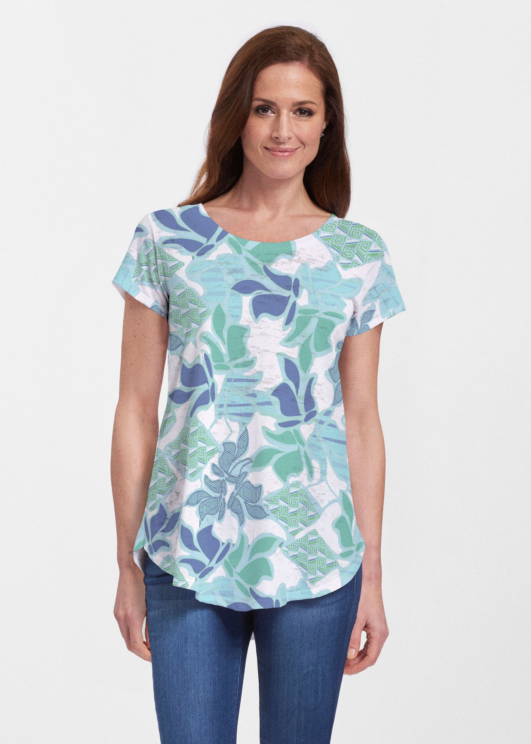 An effortlessly flattering tunic in our soft Signature burnout fabric featuring short sleeves and a scoop neck with a body that flows into a full, swinging shirttail hem.