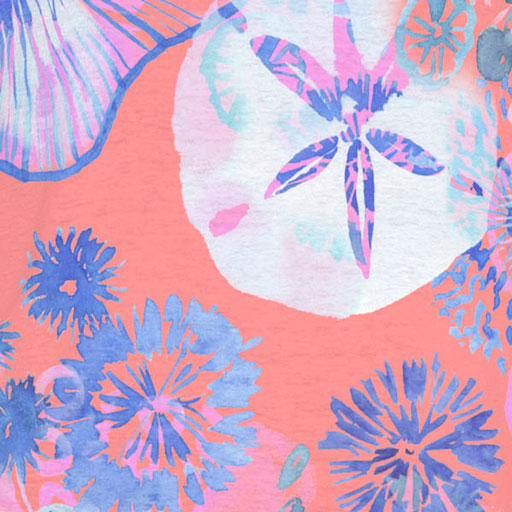 A beachy feel print of blue and pink flowers with hints of sand dollars on a vibrant background.