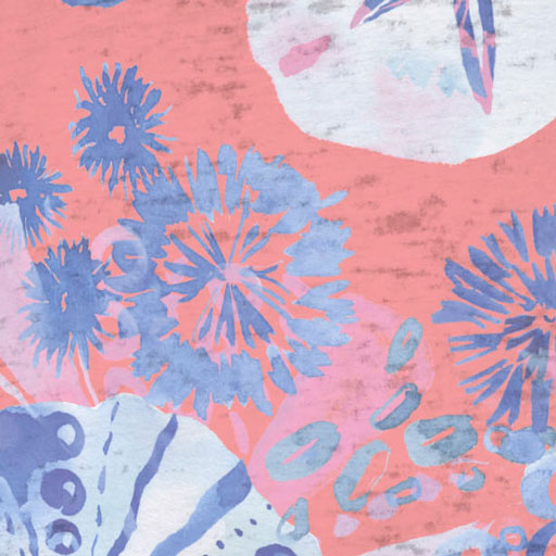 A beachy feel print of blue and pink flowers with hints of sand dollars on a vibrant background.