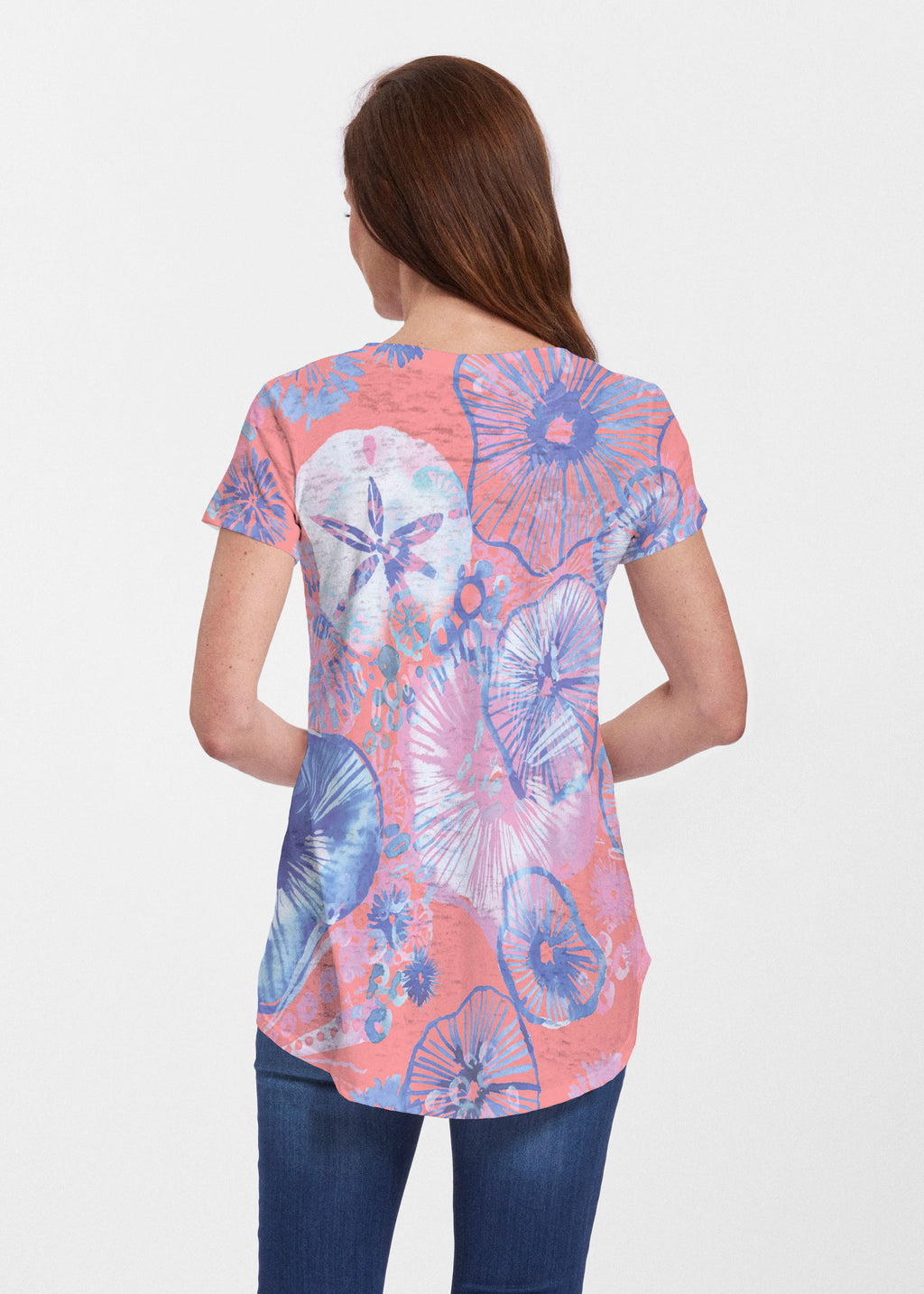 An effortlessly flattering tunic in our soft Signature burnout fabric featuring short sleeves and a scoop neck with a body that flows into a full, swinging shirttail hem.