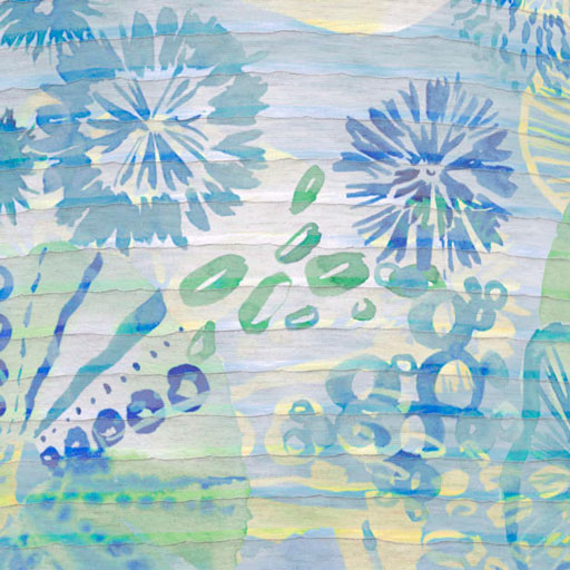 A beachy feel print of aquas and yellow flowers with hints of sand dollars on a vibrant background.