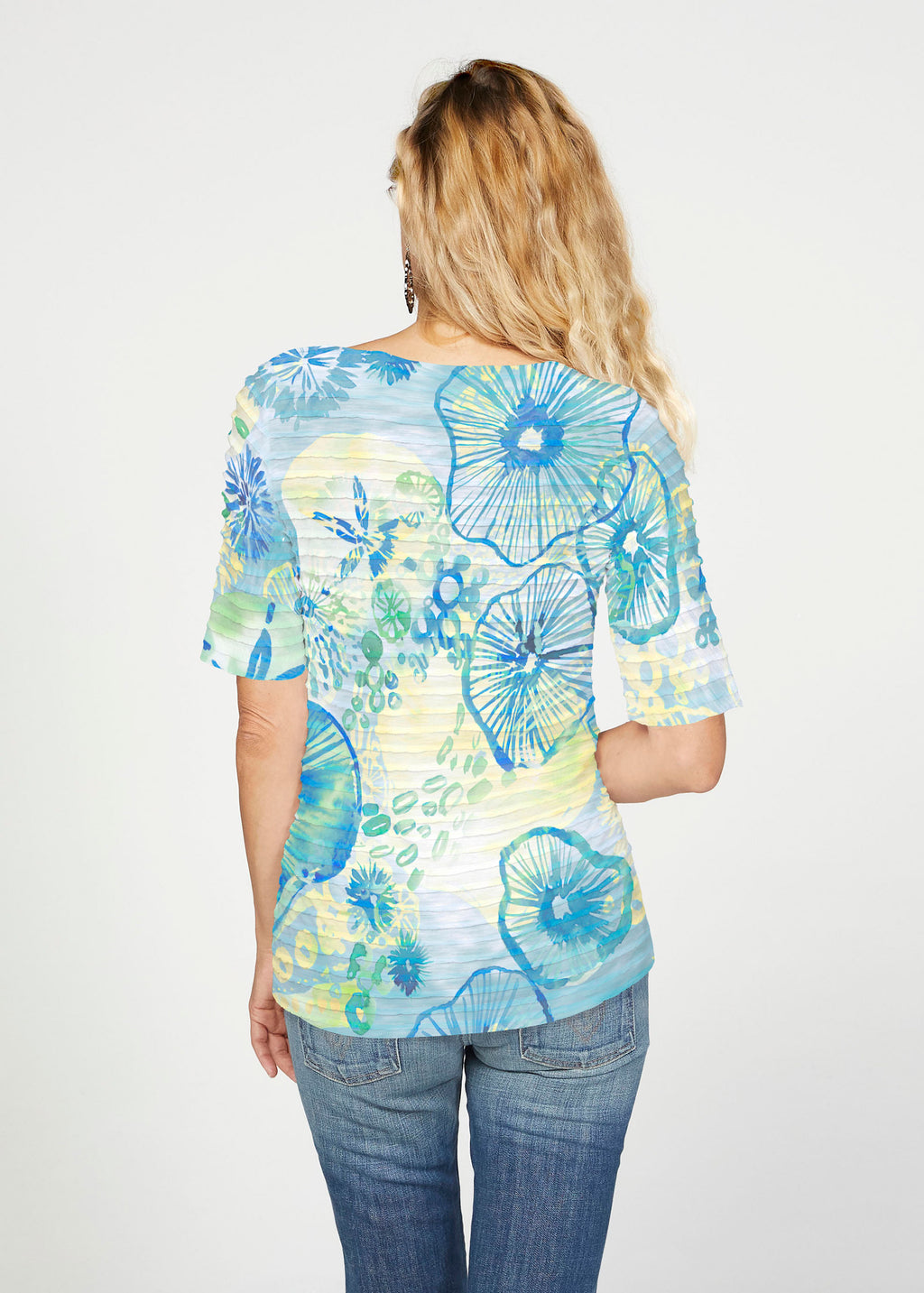 The uniquely soft, pleated texture in this Banded fabric gives the elbow sleeve and boat neck top a fun and sophisticated look. Easy relaxed fit with a hemline that comes below the hip.
