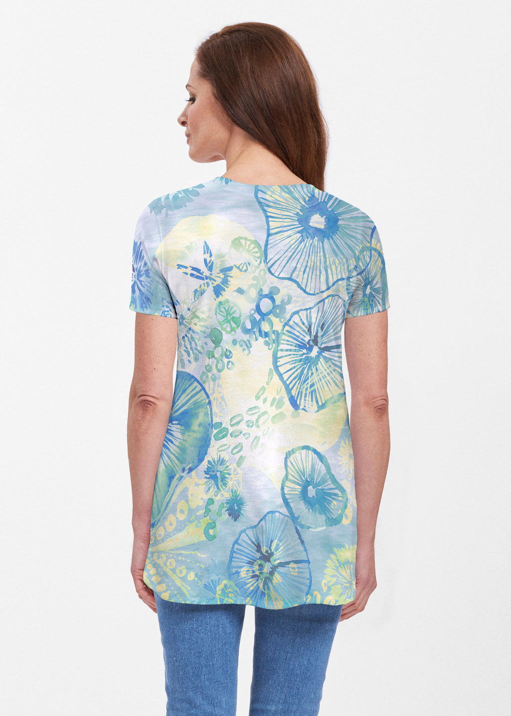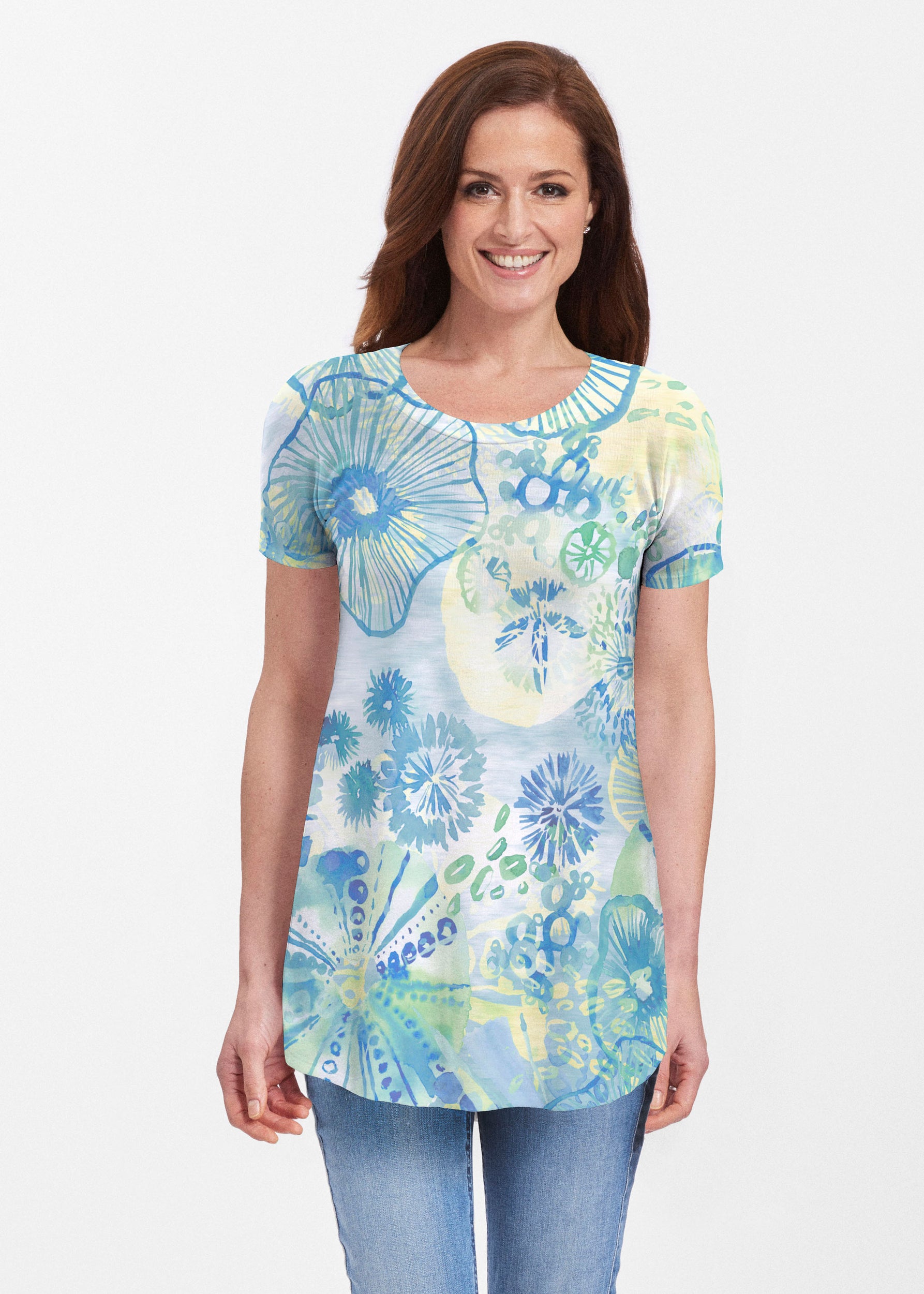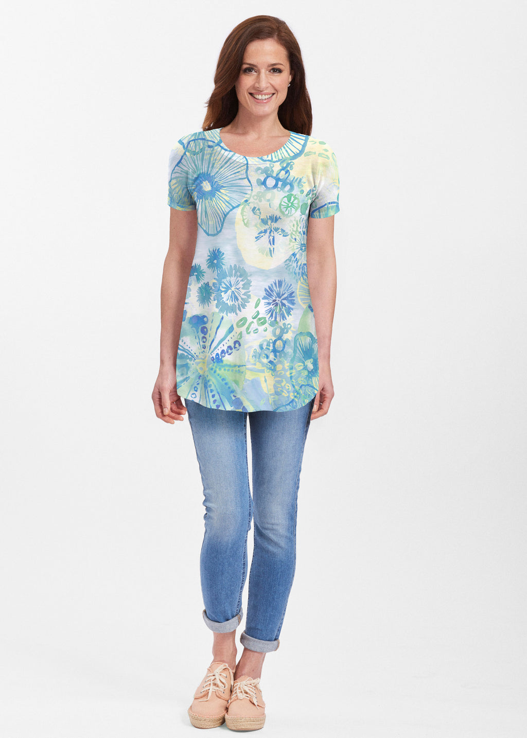 Our soft and feminine short sleeve silhouette tunic is sure to flatter any figure. Made in our Butterknit fabic that flows into a relaxed curved hem that is slightly longer in the back with subtle side slits.