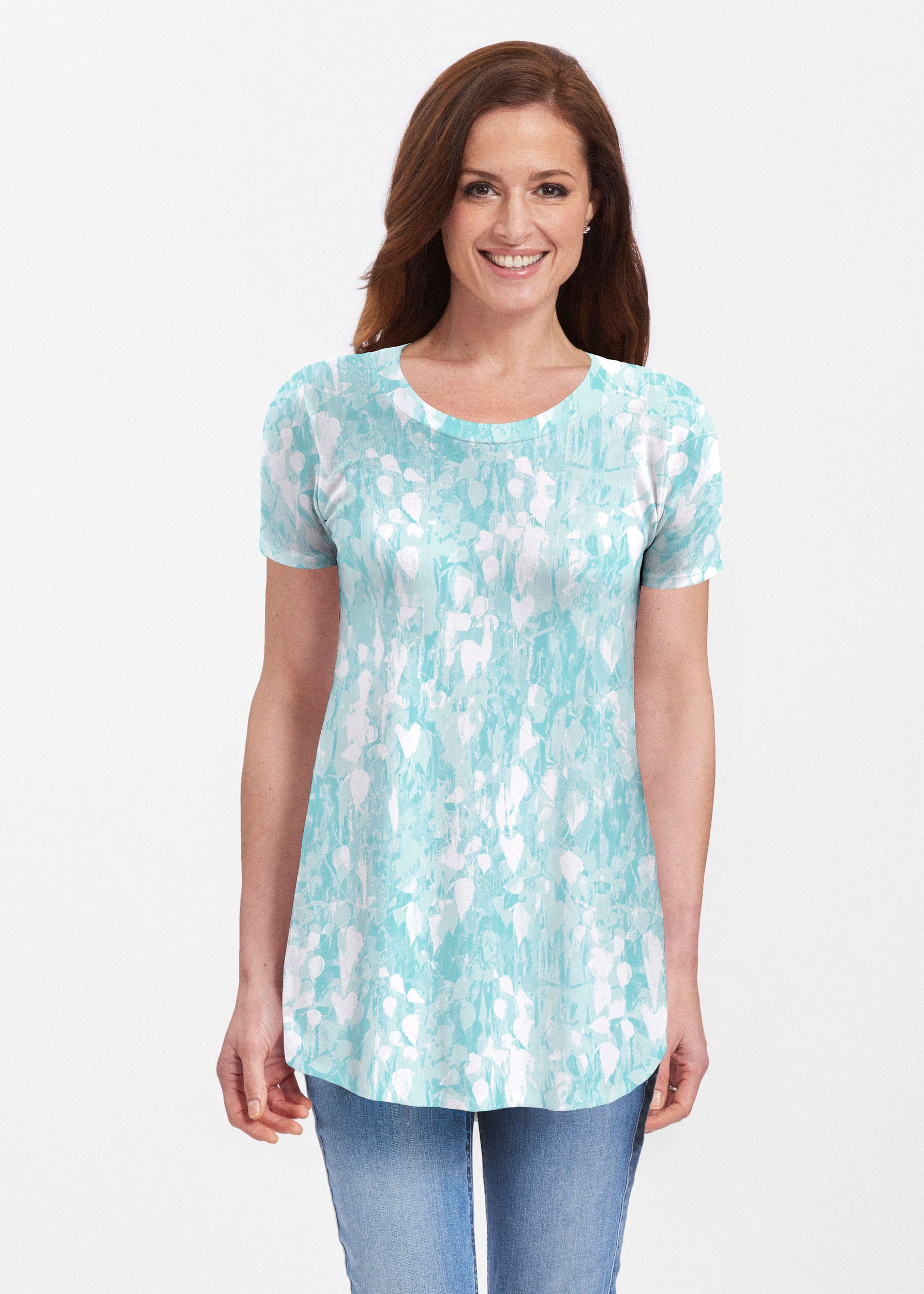 Our soft and feminine short sleeve silhouette tunic is sure to flatter any figure. Made in our Butterknit fabic that flows into a relaxed curved hem that is slightly longer in the back with subtle side slits.