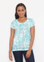 A beautiful graphic floral print with faded leaf textures in shades of aqua and white designed by Susan Werner.