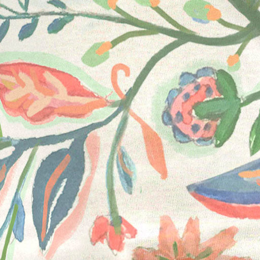 A stunning and playful floral print in coral, aqua, blue and green, designed by Jeanetta Gonzales.