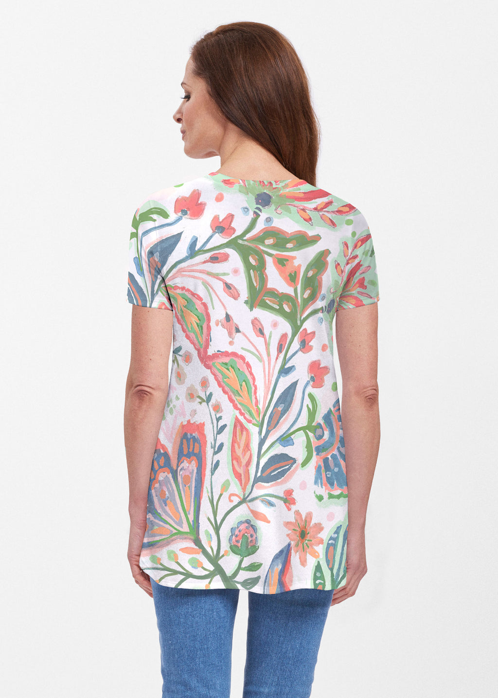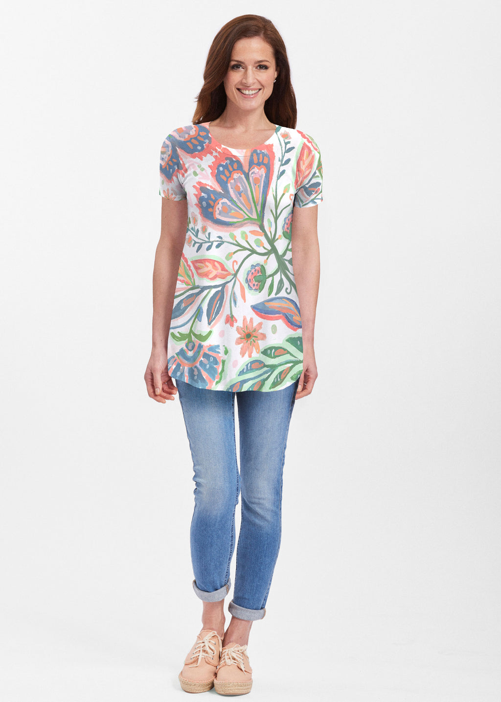 Our soft and feminine short sleeve silhouette tunic is sure to flatter any figure. Made in our Butterknit fabic that flows into a relaxed curved hem that is slightly longer in the back with subtle side slits.