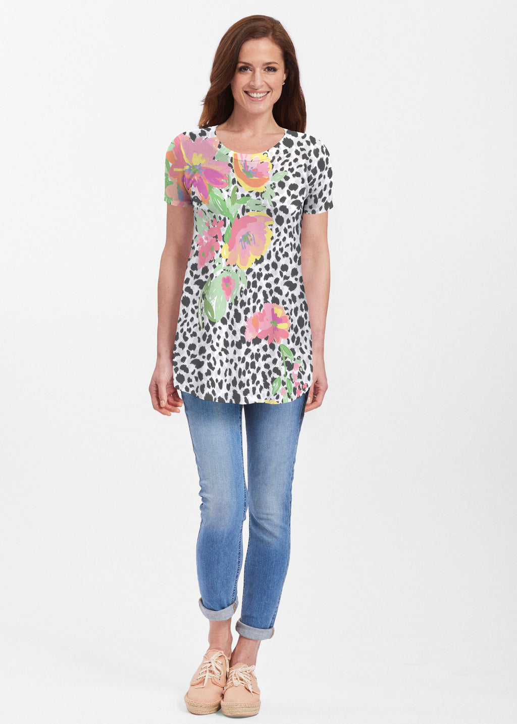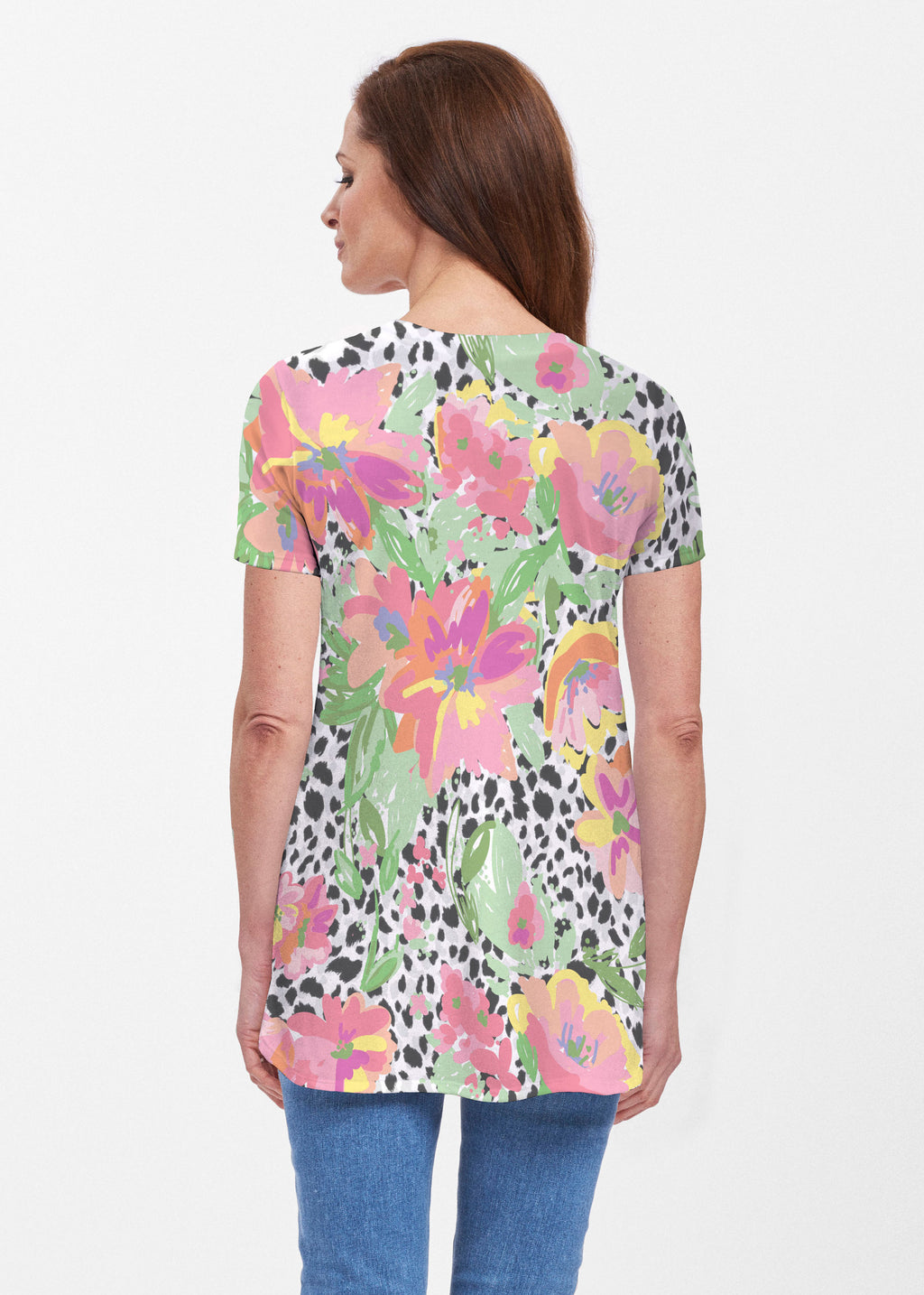 Bring out your wild side in this fun leopard and bright floral print designed by Debra Valencia.