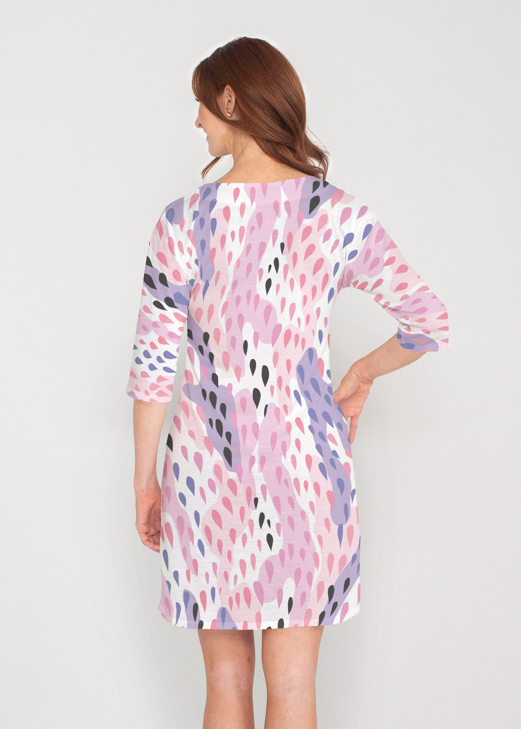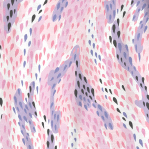 A playful animal print design of raindrops in shades of pink & lavender with a hint of black on a white canvas.