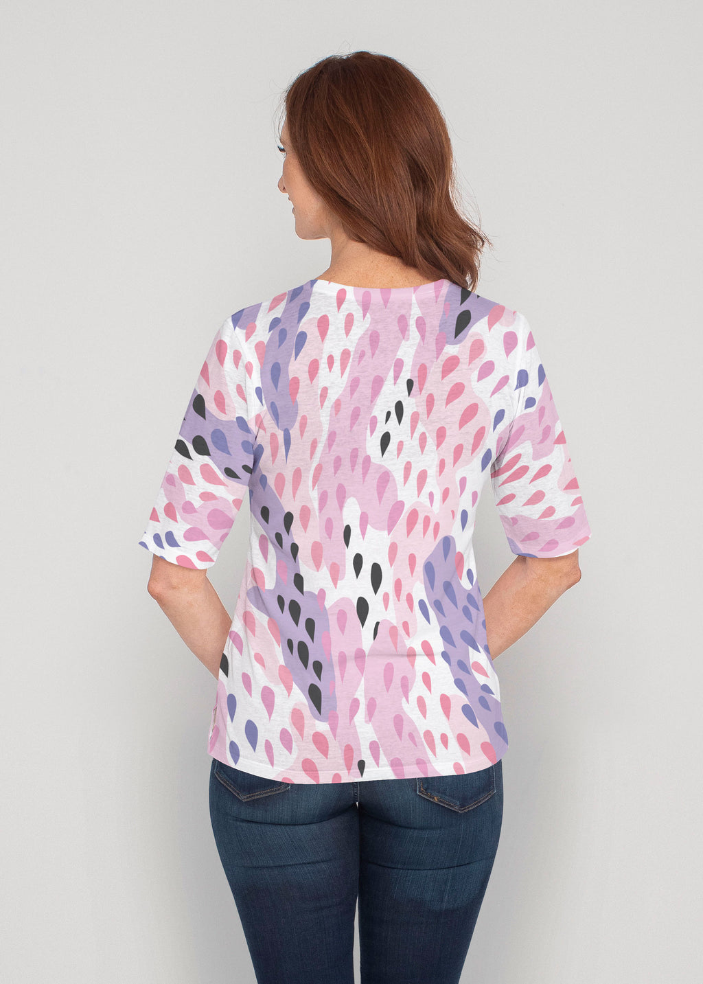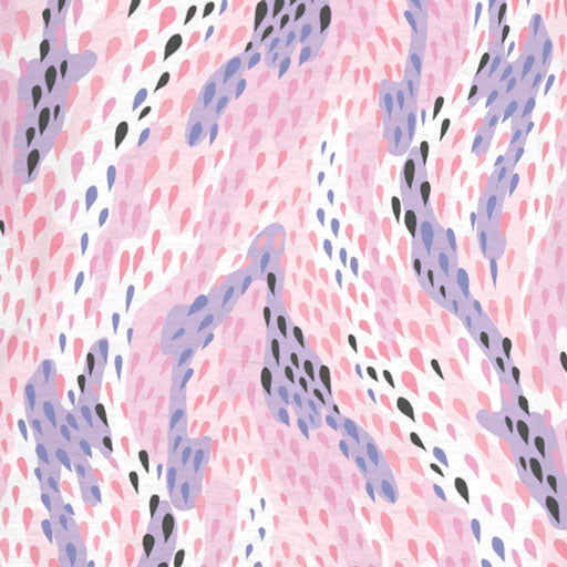 A playful animal print design of raindrops in shades of pink & lavender with a hint of black on a white canvas.