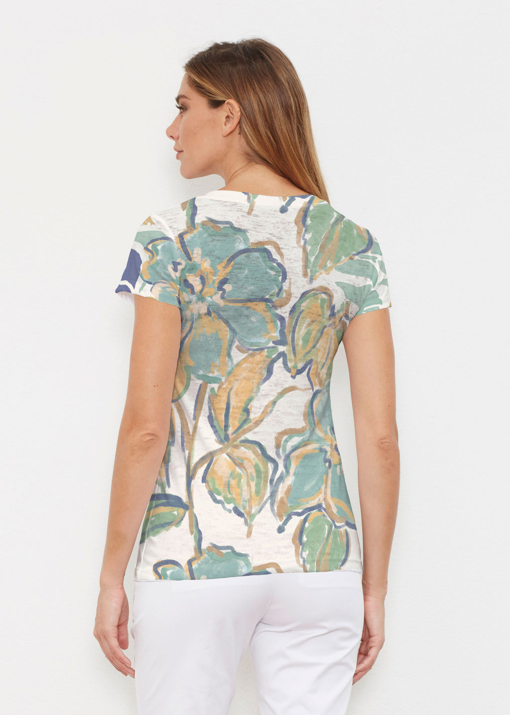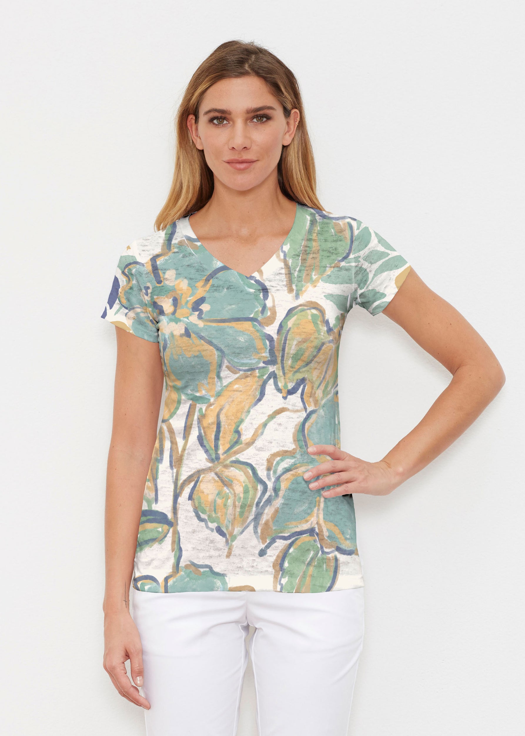 Created in soft, casual burn-out Signature blend, this tee features a subtle v-neck and cap sleeves.