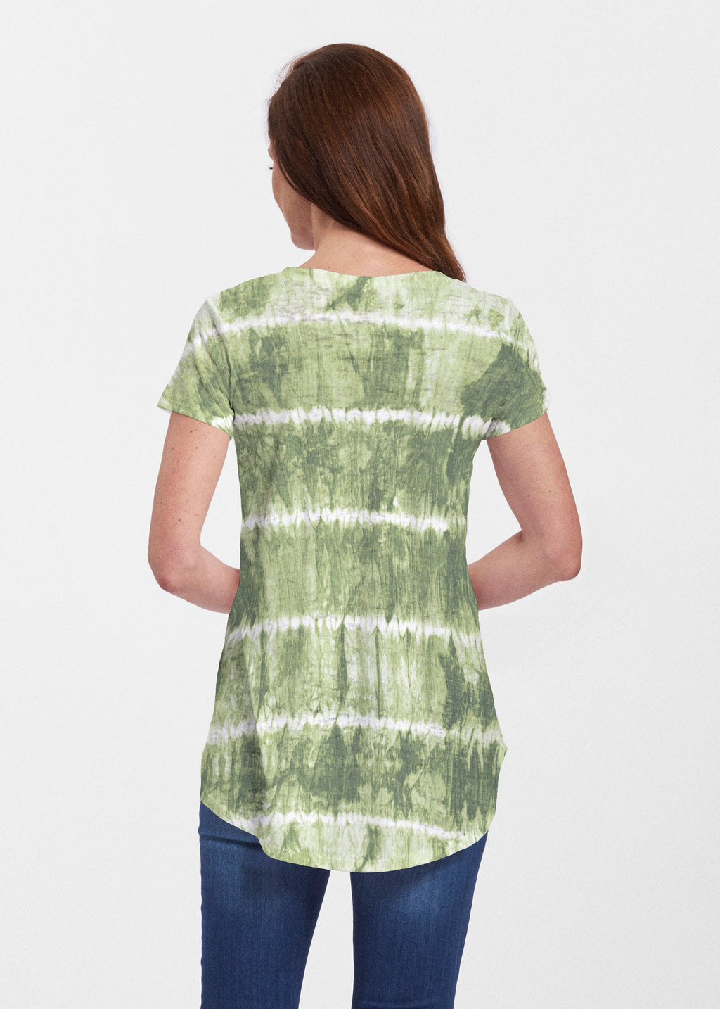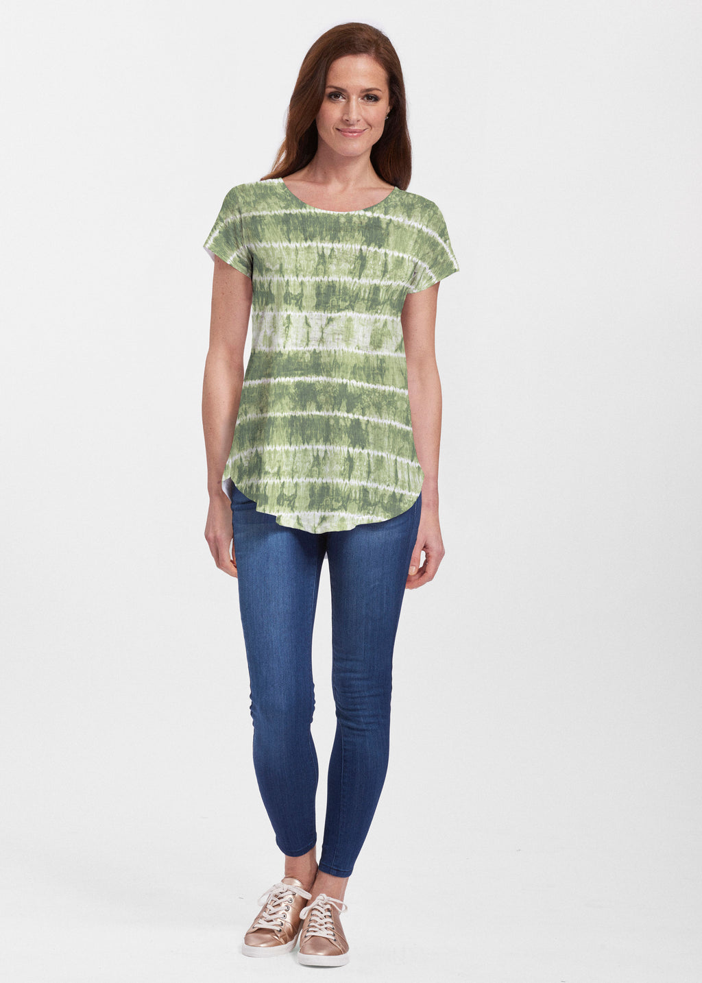 This striped tie dye print in so in trend right now with shades of green and white designed by Debra Valencia.