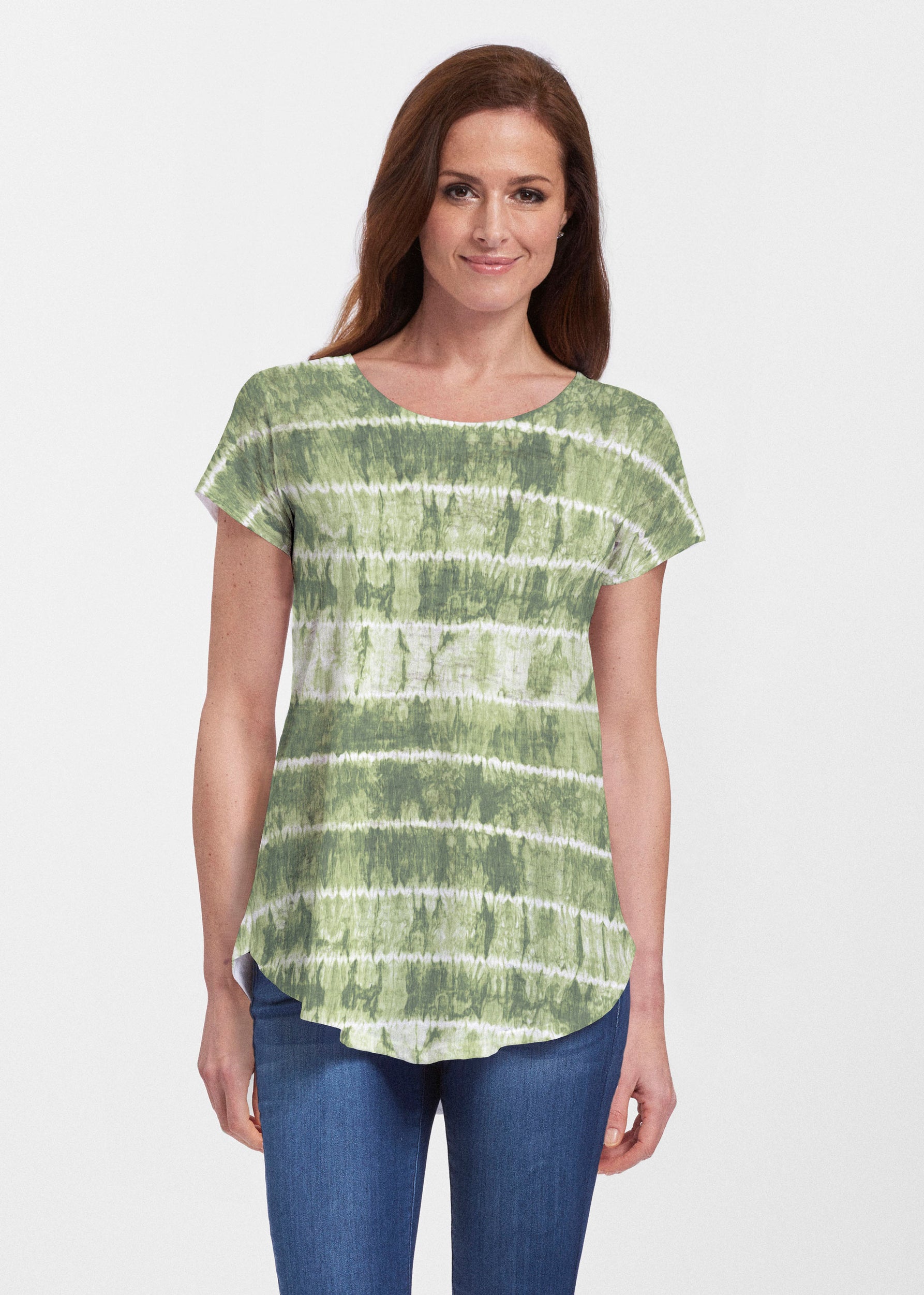 An effortlessly flattering tunic in our soft Signature burnout fabric featuring short sleeves and a scoop neck with a body that flows into a full, swinging shirttail hem.