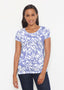 A clean and refreshing print design featuring a blue on white artisanal stencil print. This design captures the essence of summer with a delicate and airy portrayal of periwinkle flowers in a floral pattern.