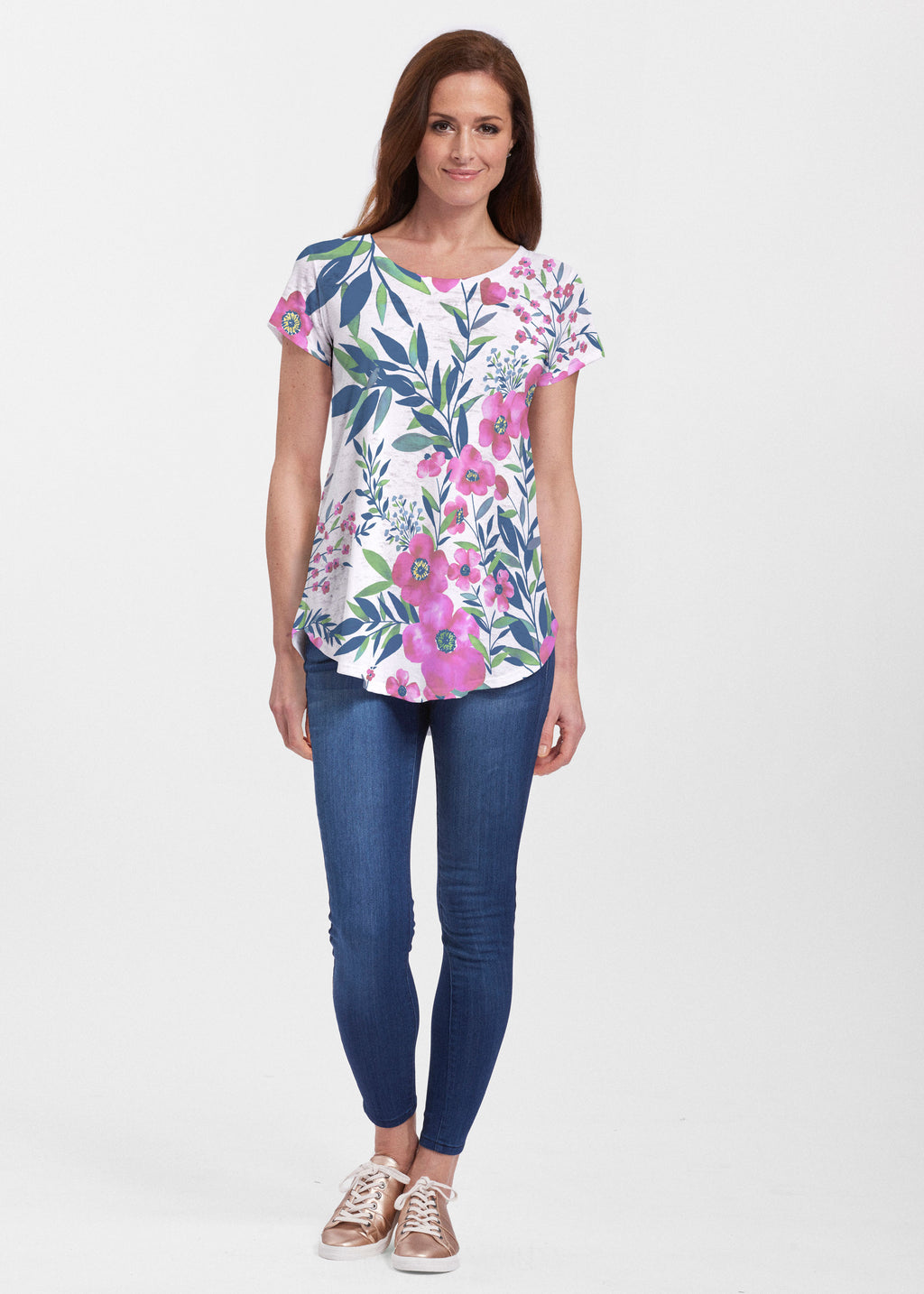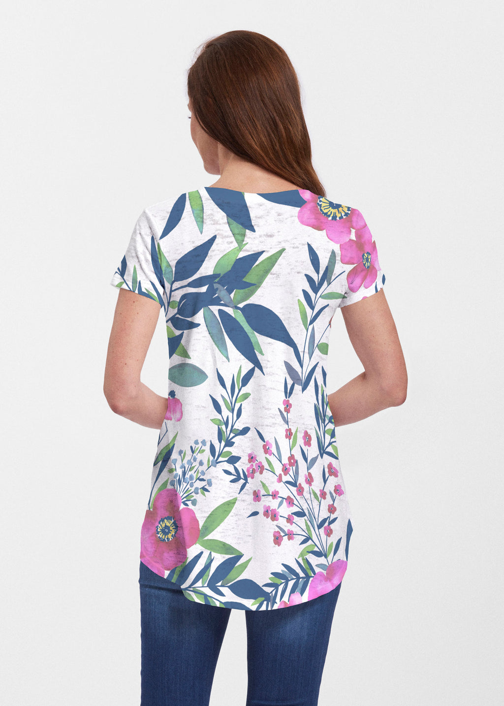 An effortlessly flattering tunic in our soft Signature burnout fabric featuring short sleeves and a scoop neck with a body that flows into a full, swinging shirttail hem.