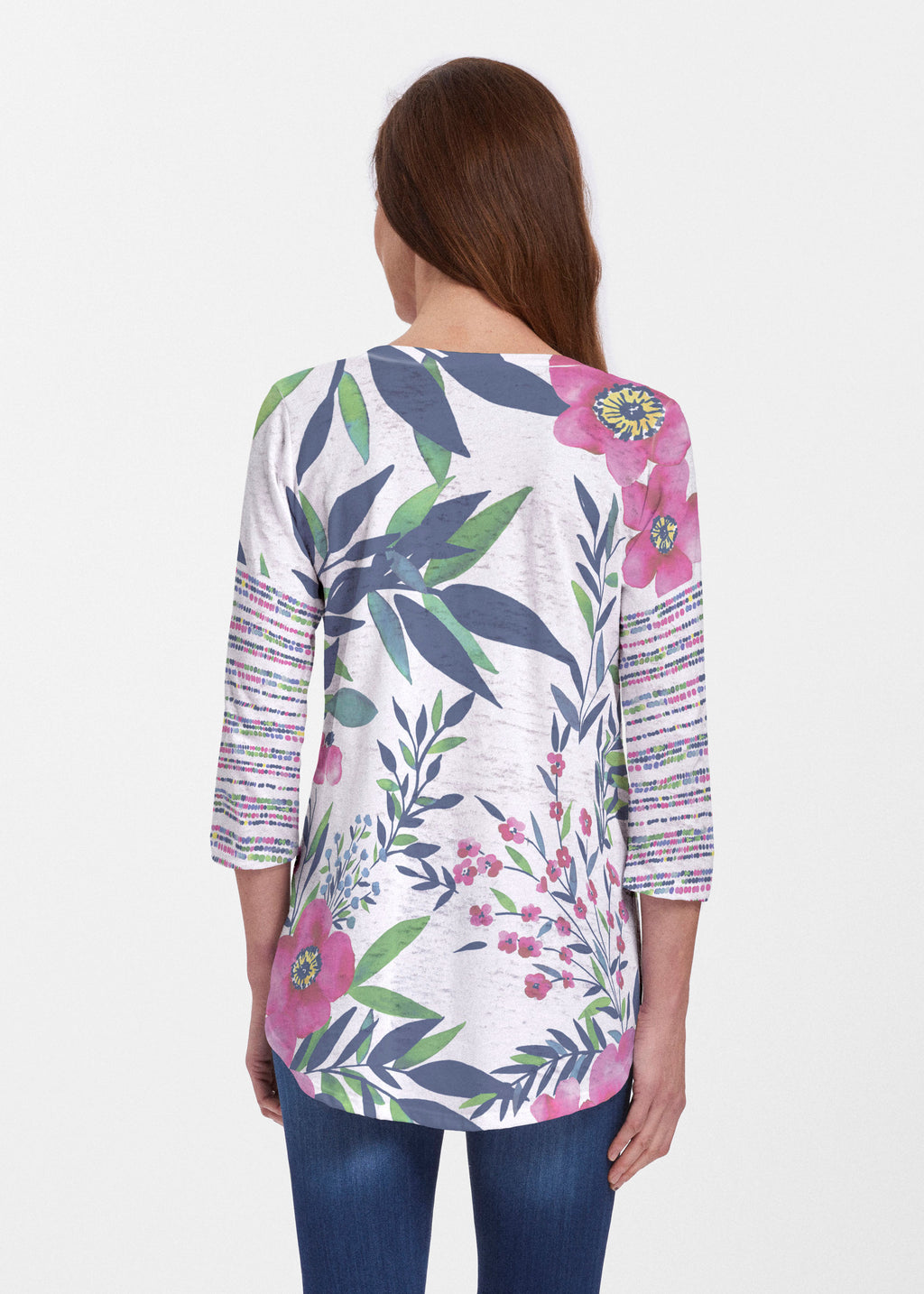 This v-neck tunic in our Signature burnout fabric is forever flattering. 3/4 sleeves and a v-neck flow into a full, swinging shirttail hem.