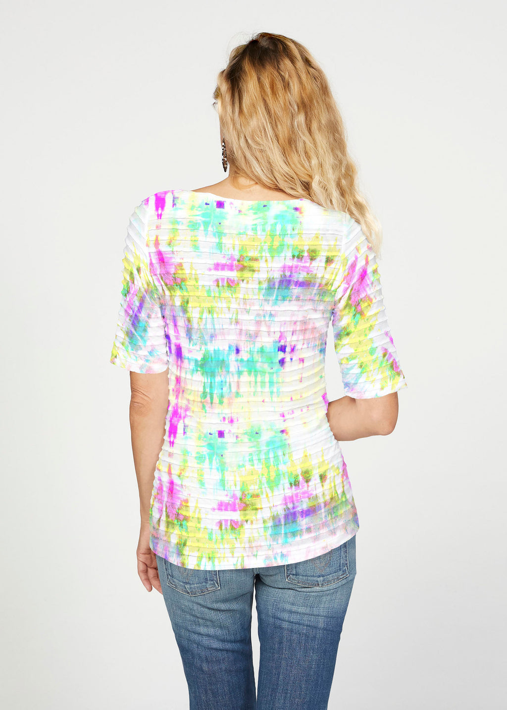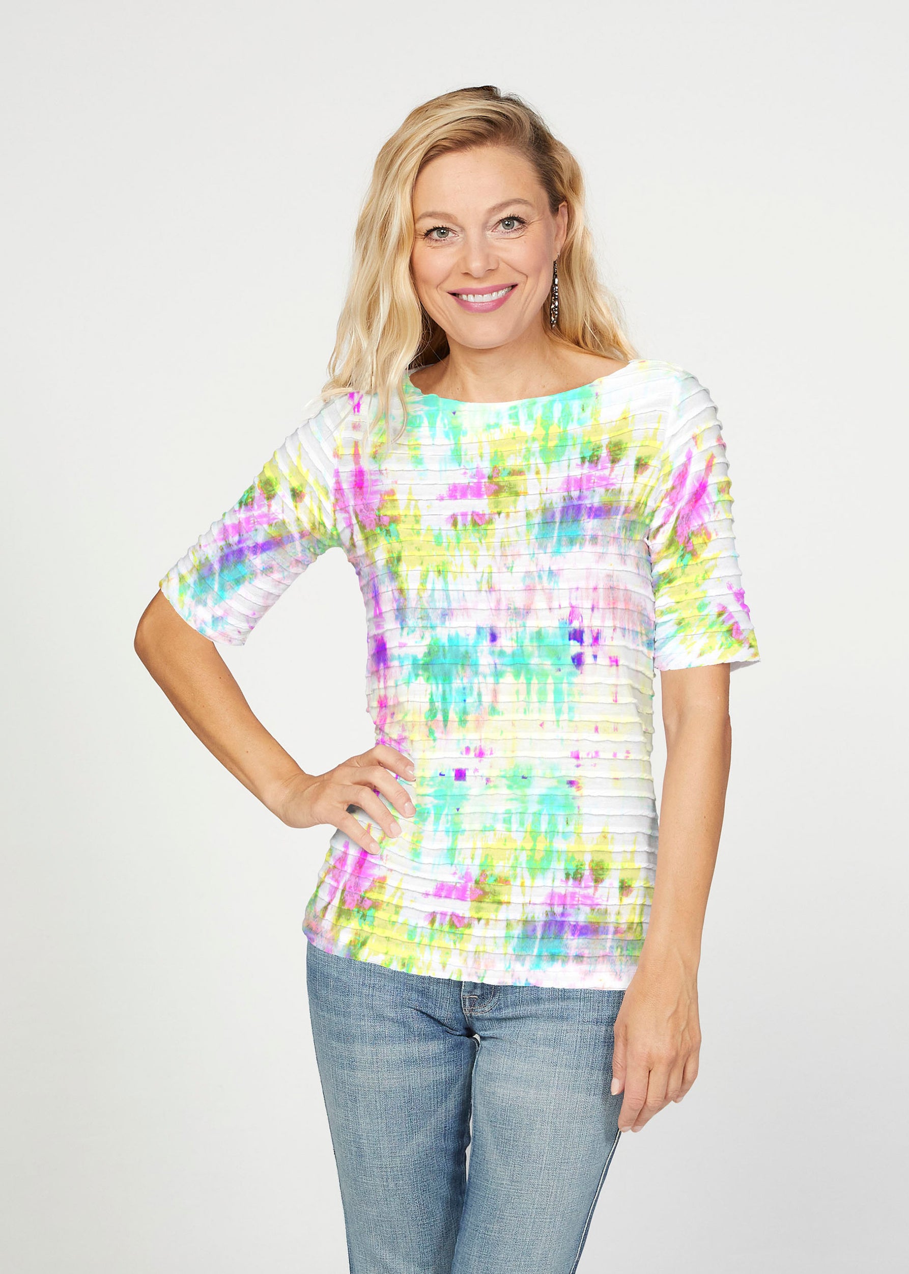 The uniquely soft, pleated texture in this Banded fabric gives the elbow sleeve and boat neck top a fun and sophisticated look. Easy relaxed fit with a hemline that comes below the hip.