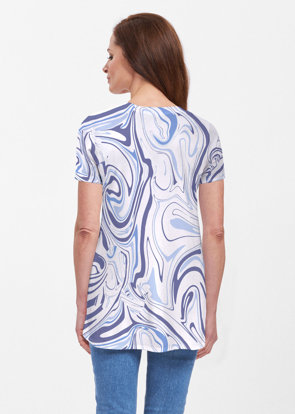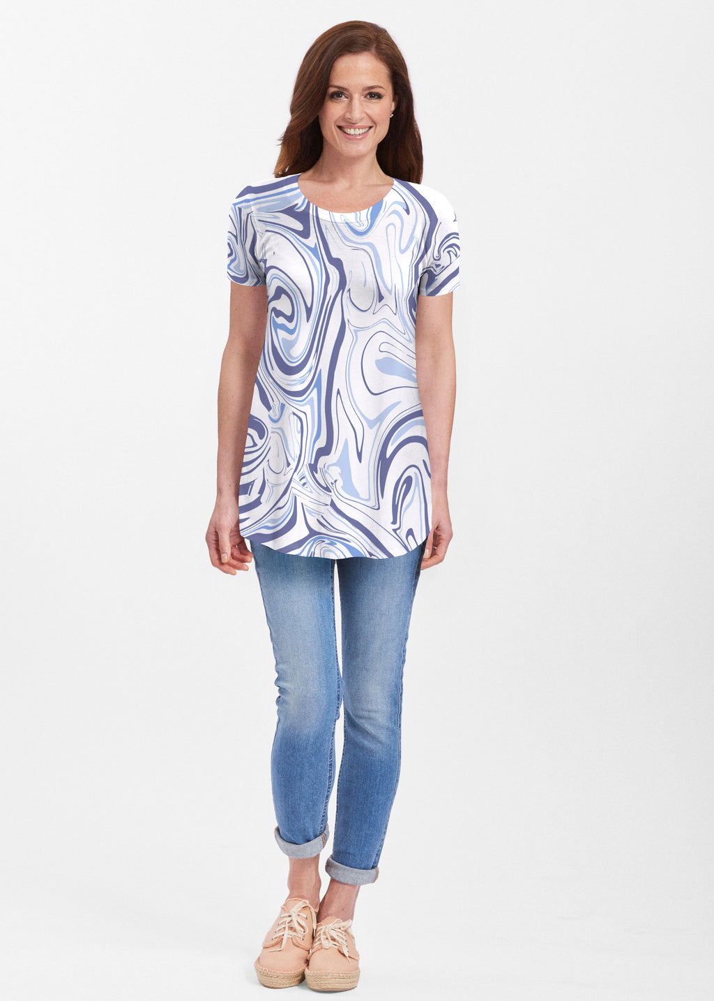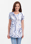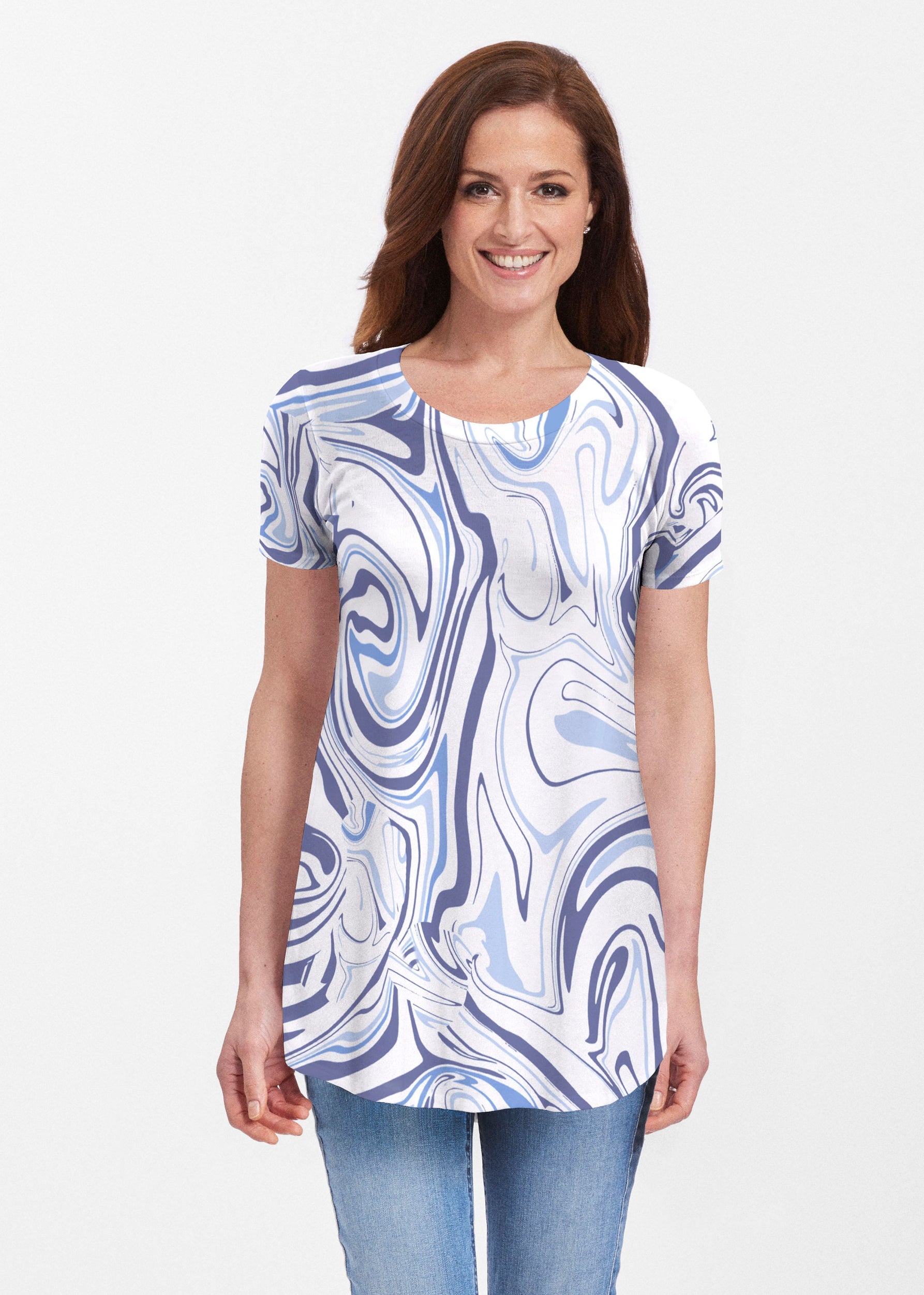 Our soft and feminine short sleeve silhouette tunic is sure to flatter any figure. Made in our Butterknit fabic that flows into a relaxed curved hem that is slightly longer in the back with subtle side slits.