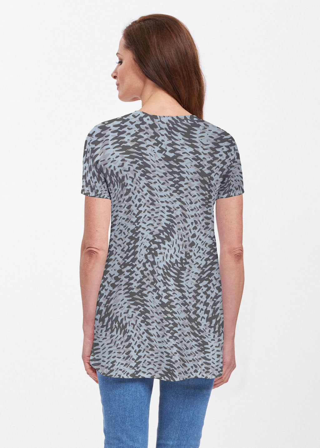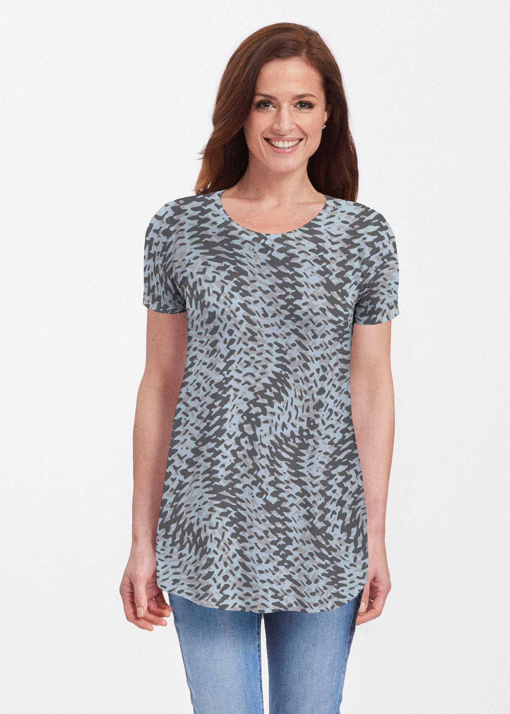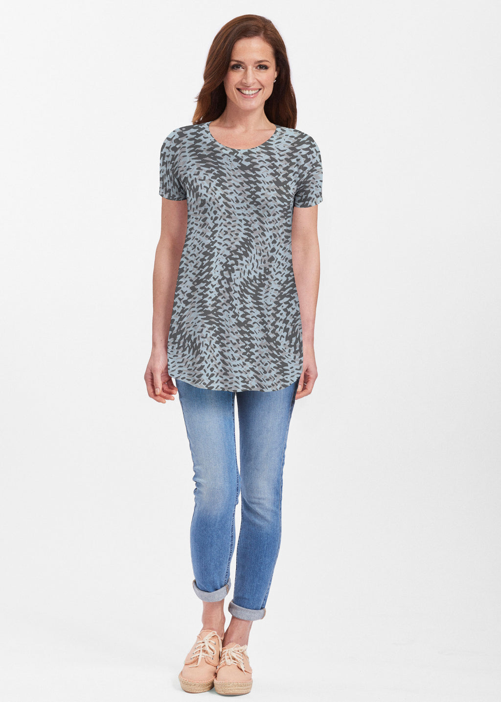 Our soft and feminine short sleeve silhouette tunic is sure to flatter any figure. Made in our Butterknit fabic that flows into a relaxed curved hem that is slightly longer in the back with subtle side slits.