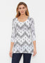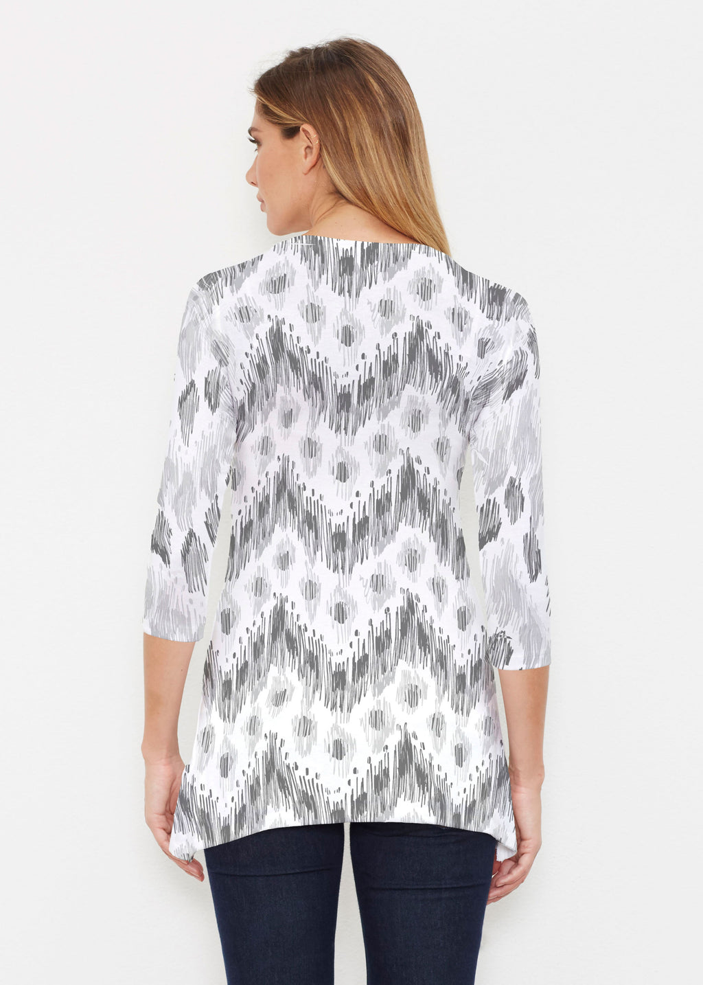 Intricate hatched lines form abstract ikat patterns that flow in a visually striking chevron design in shades of black and grey. Designed by Susan Werner.