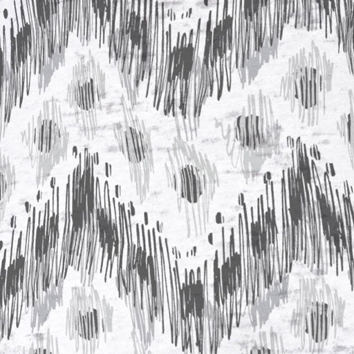 Intricate hatched lines form abstract ikat patterns that flow in a visually striking chevron design in shades of black and grey. Designed by Susan Werner.