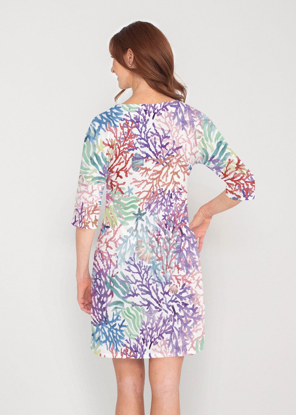 Be comfortable and fashionable all day in our soft Lucy fabric. This v-neck dress features loose 3/4 sleeves, drop shoulders and falls just at the knee.