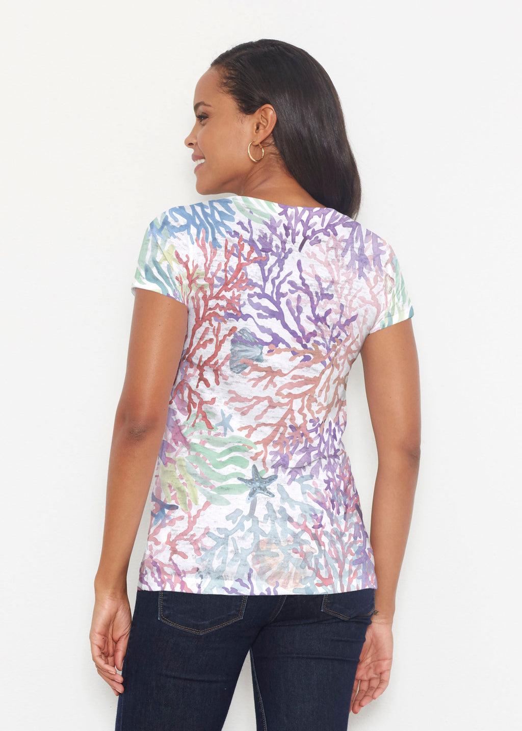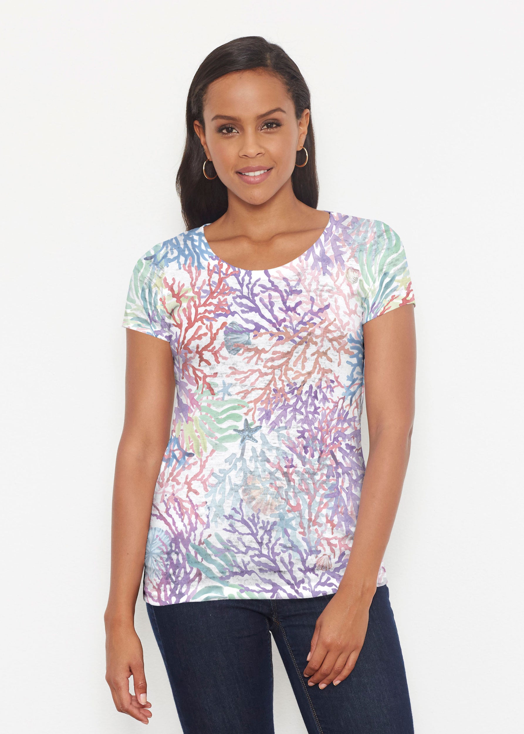 A white canvas of tropic coral in gorgeous shades of aqua, green, pink and purple.