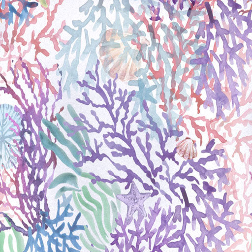 A white canvas of tropic coral in gorgeous shades of aqua, green, pink and purple.