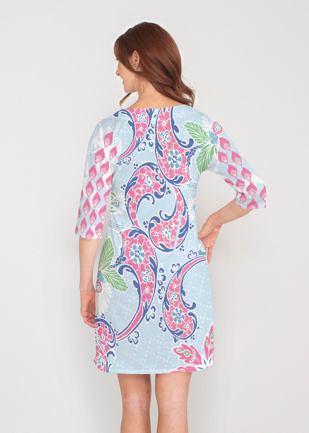 Hot pink and white geo bud sleeve with a tropical floral explosion of pink & green on the shoulder that lends to a backdrop of hot pink & navy paisley.