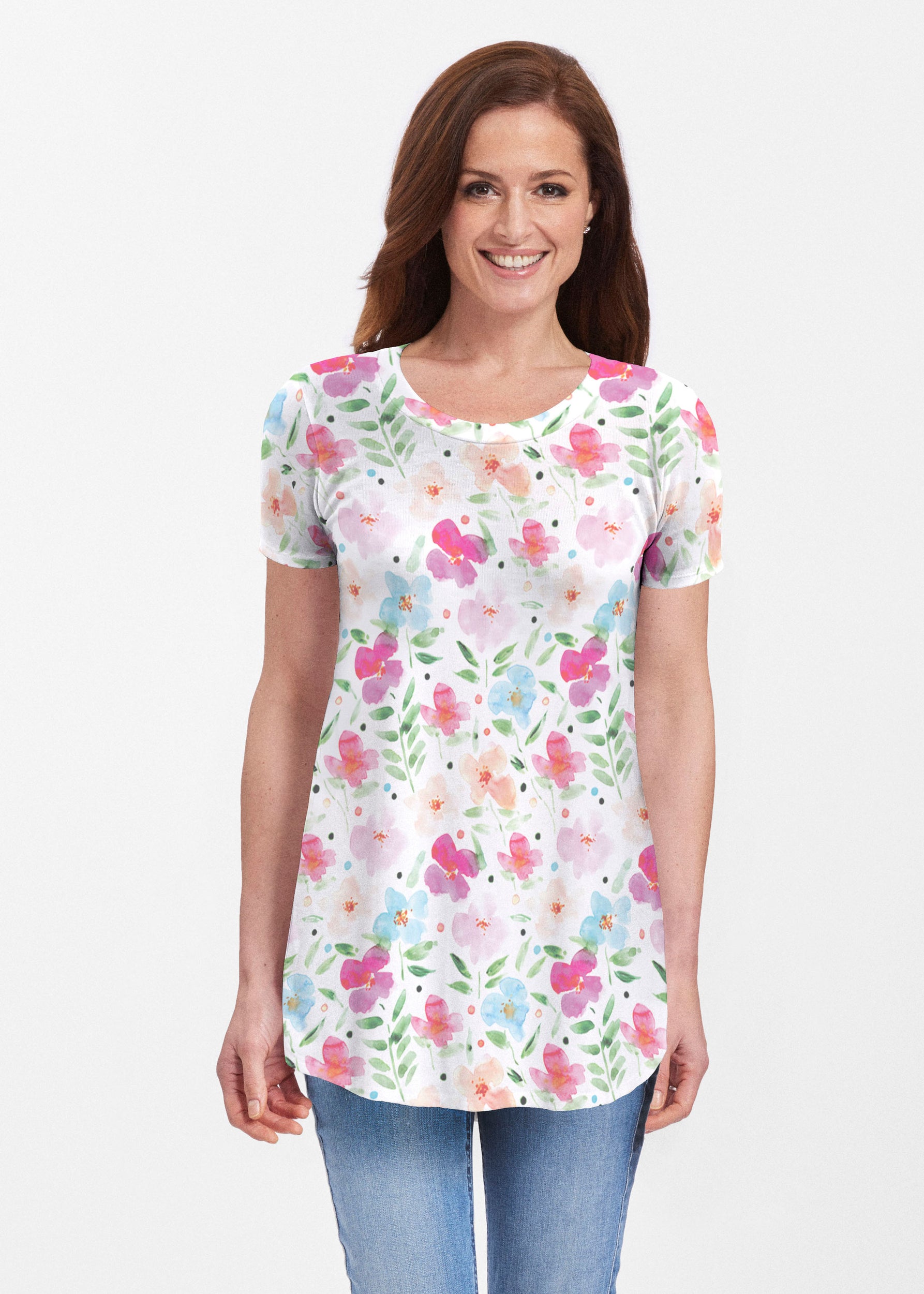 Our soft and feminine short sleeve silhouette tunic is sure to flatter any figure. Made in our Butterknit fabic that flows into a relaxed curved hem that is slightly longer in the back with subtle side slits.