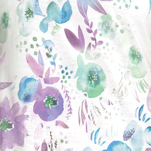A gentle touch of violets and shades of turquoise in a scattering watercolor floral with a white backdrop.
