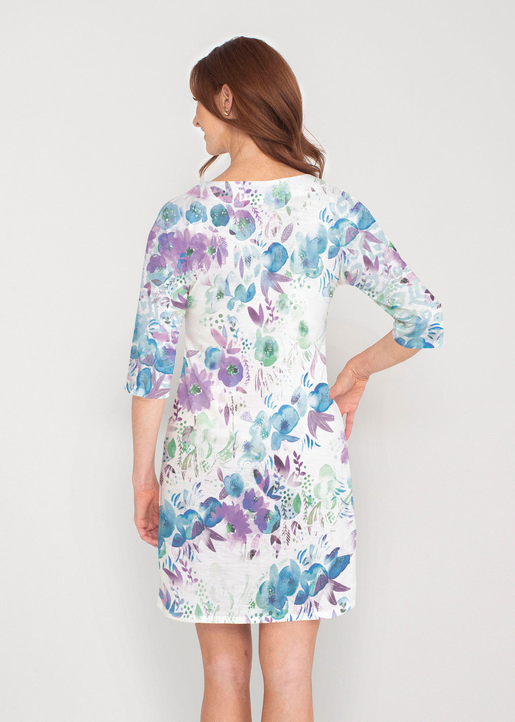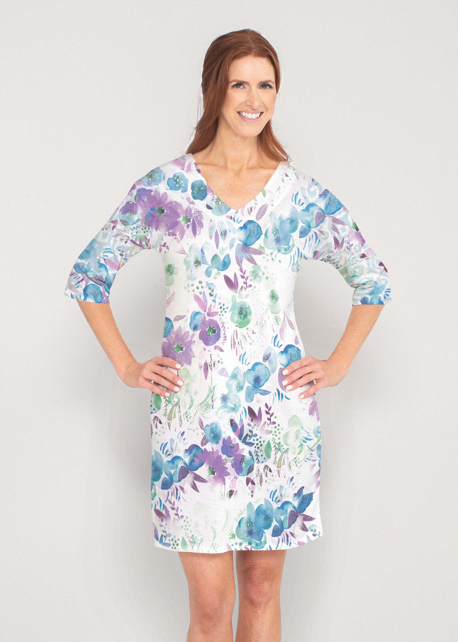 Be comfortable and fashionable all day in our light weight french terry fabric. This v-neck dress features loose 3/4 sleeves, drop shoulders and falls just at the knee.