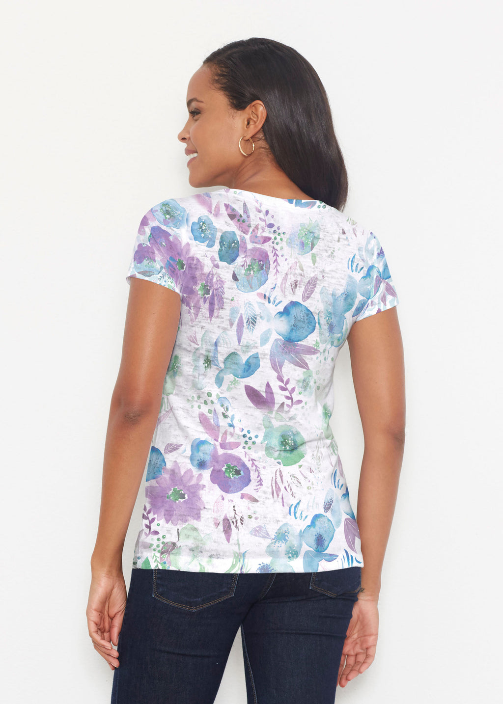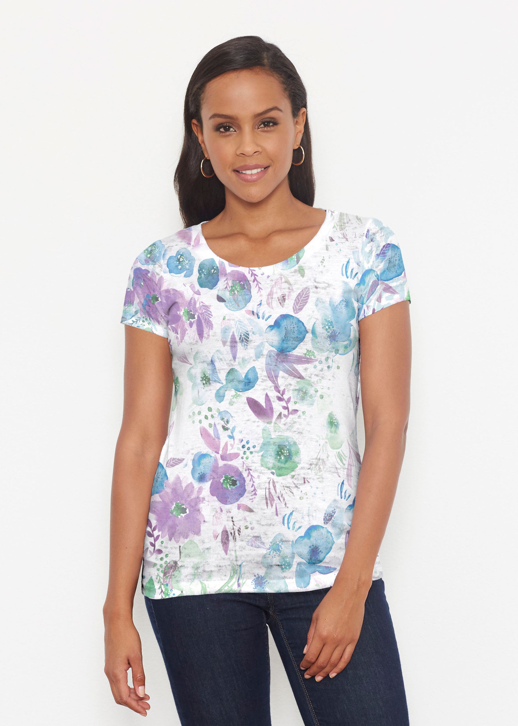 A gentle touch of violets and shades of turquoise in a scattering watercolor floral with a white backdrop.