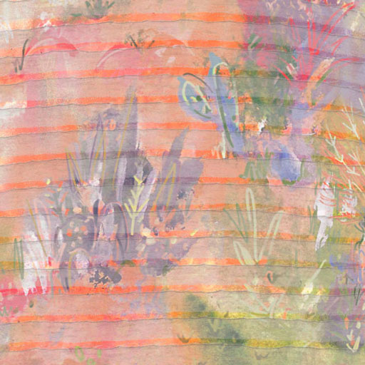 Warm autumn watercolors in oranges, greens, pinks and purples with pops of a small scale leafy print on shoulders and cuffs.