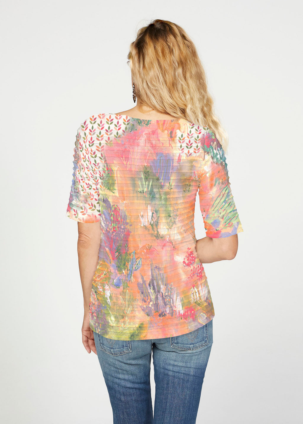 The uniquely soft, pleated texture in this Banded fabric gives the elbow sleeve and boat neck top a fun and sophisticated look. Easy relaxed fit with a hemline that comes below the hip.