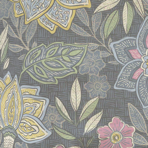 Embroidery inspired print with yellow and rose ornamental flowers on a black background with subtle crosshatch pattern designed by Diane Kappa.