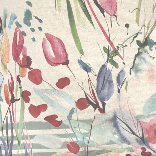 A beautiful print with soft & subtle watercolor floral blooms on a cream background with contrasting green stripes at the hem and cuffs. Designed by Sara Berrenson.